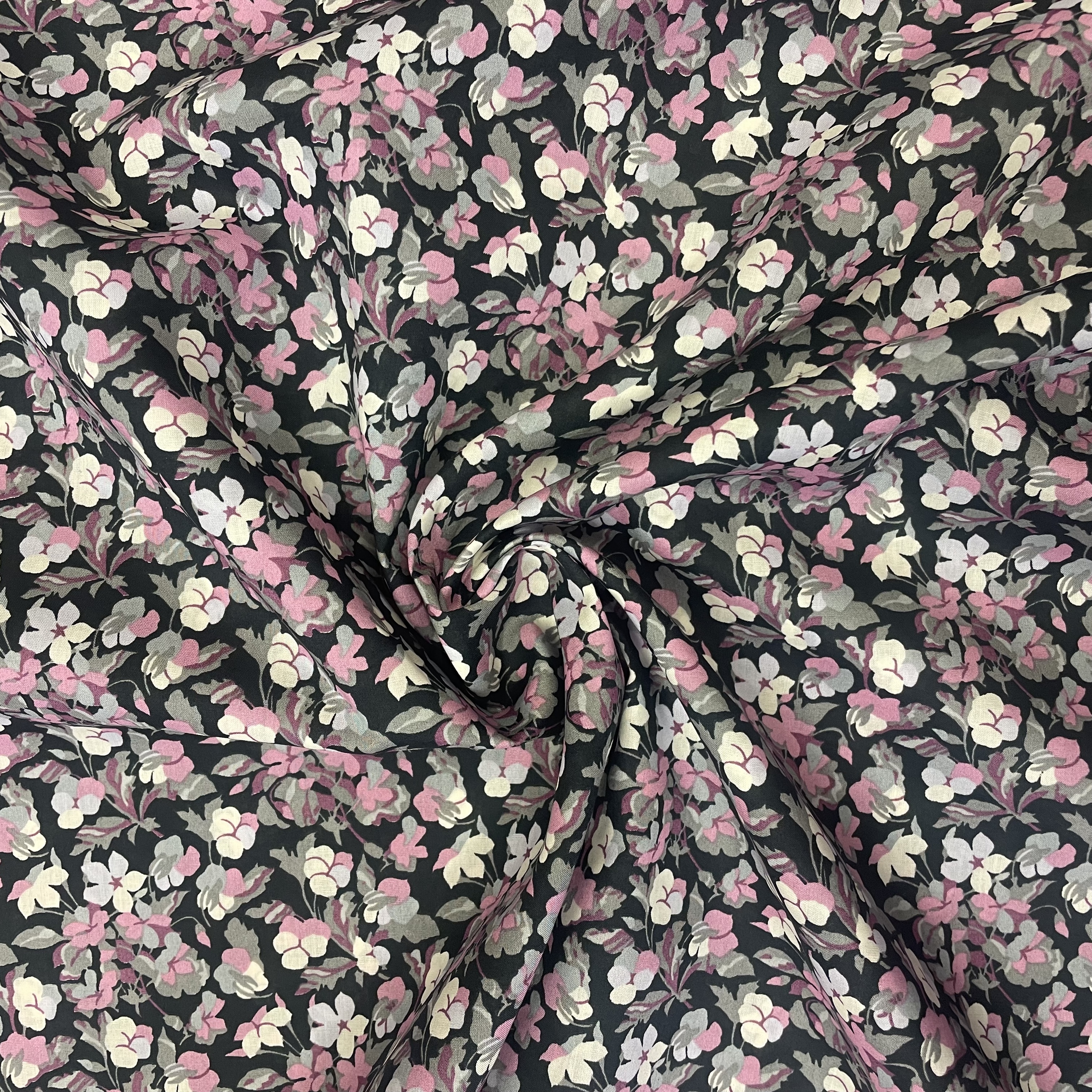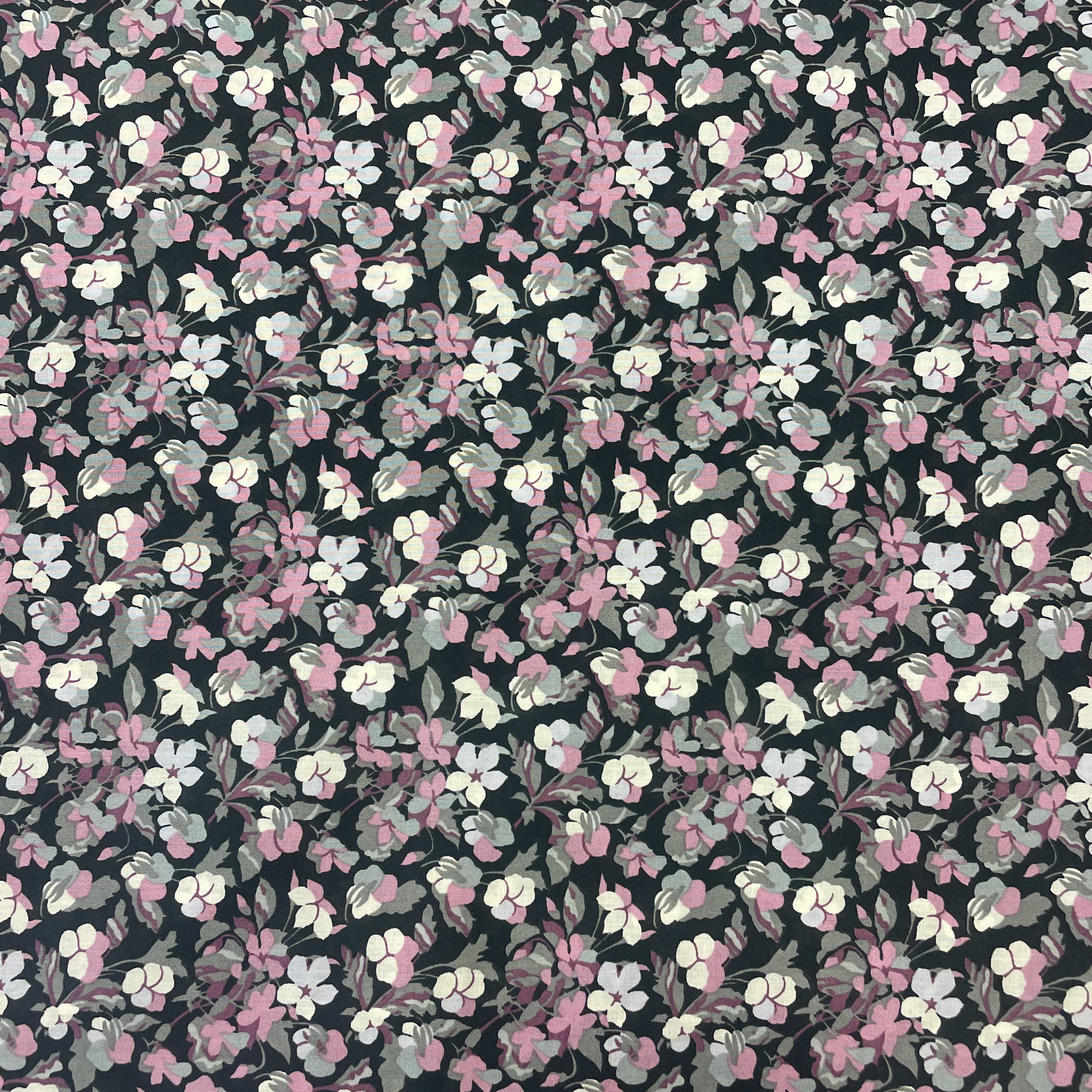 Smuk Liberty bomuld i sort med blomsterprint i hvid, grå og lyserød. Denne Liberty har et elegant udtryk med de små blomster, der går godt til både børn og voksne.
