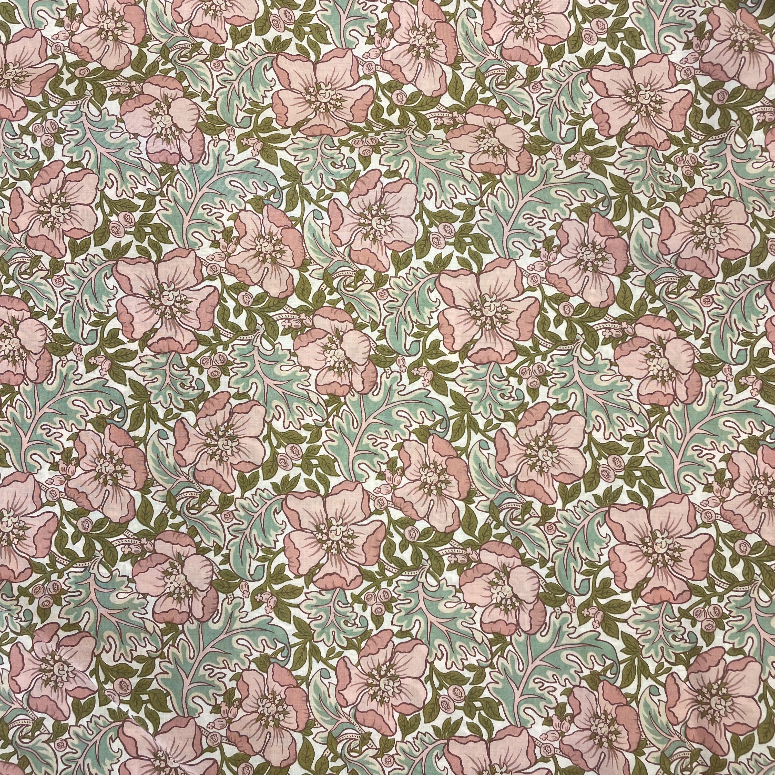 Smuk Liberty bomuld med blomster i lyserød og pink på grøn baggrund.