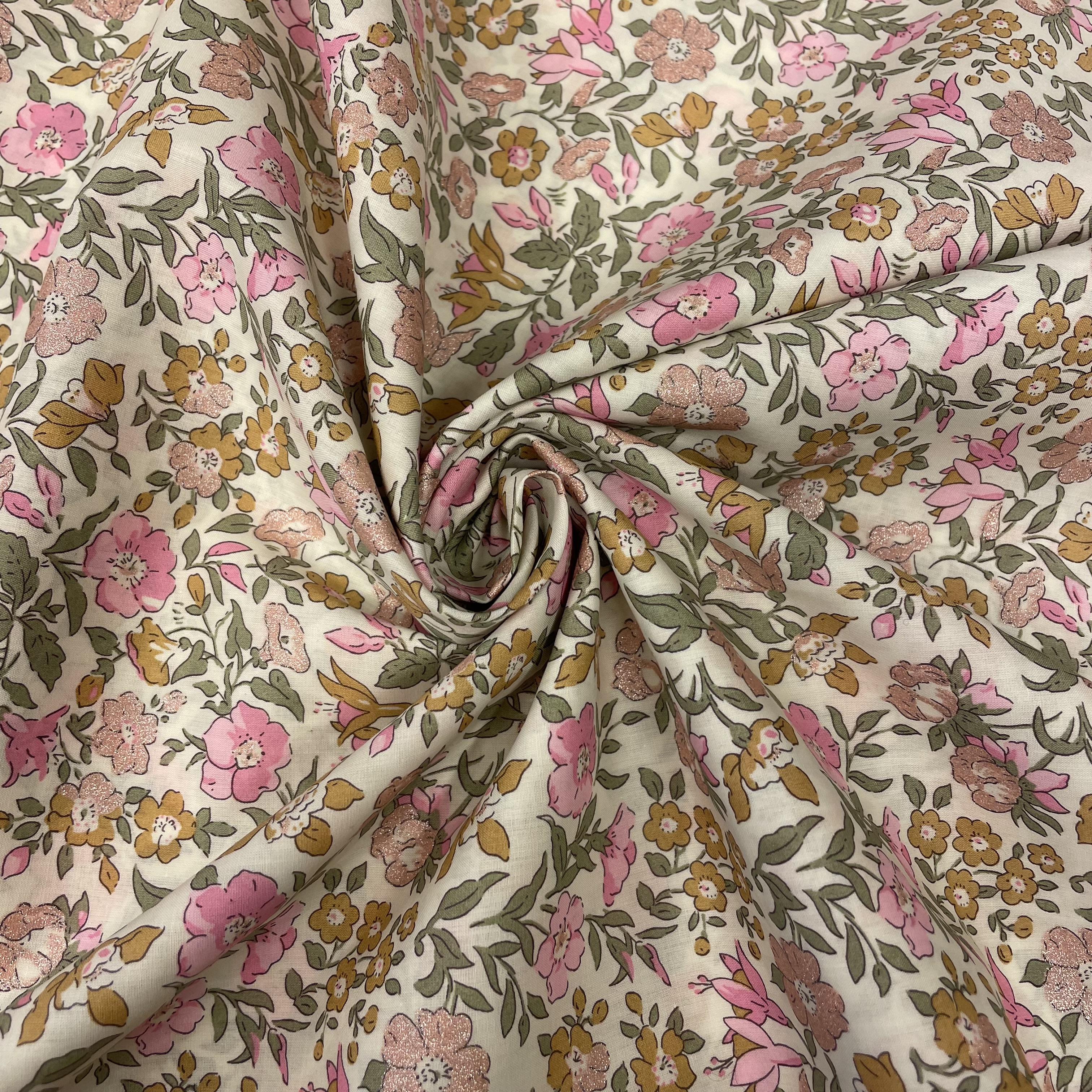Smuk Liberty Stof med små blomster i pink, camel og grøn på hvid baggrund