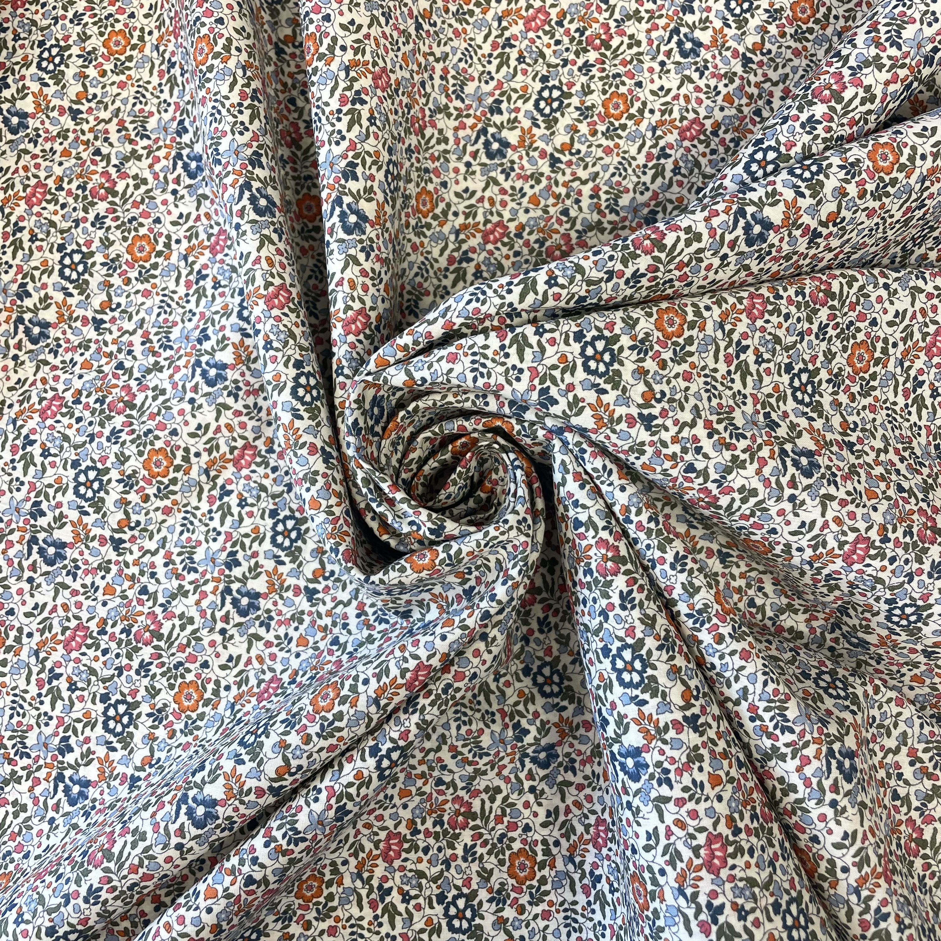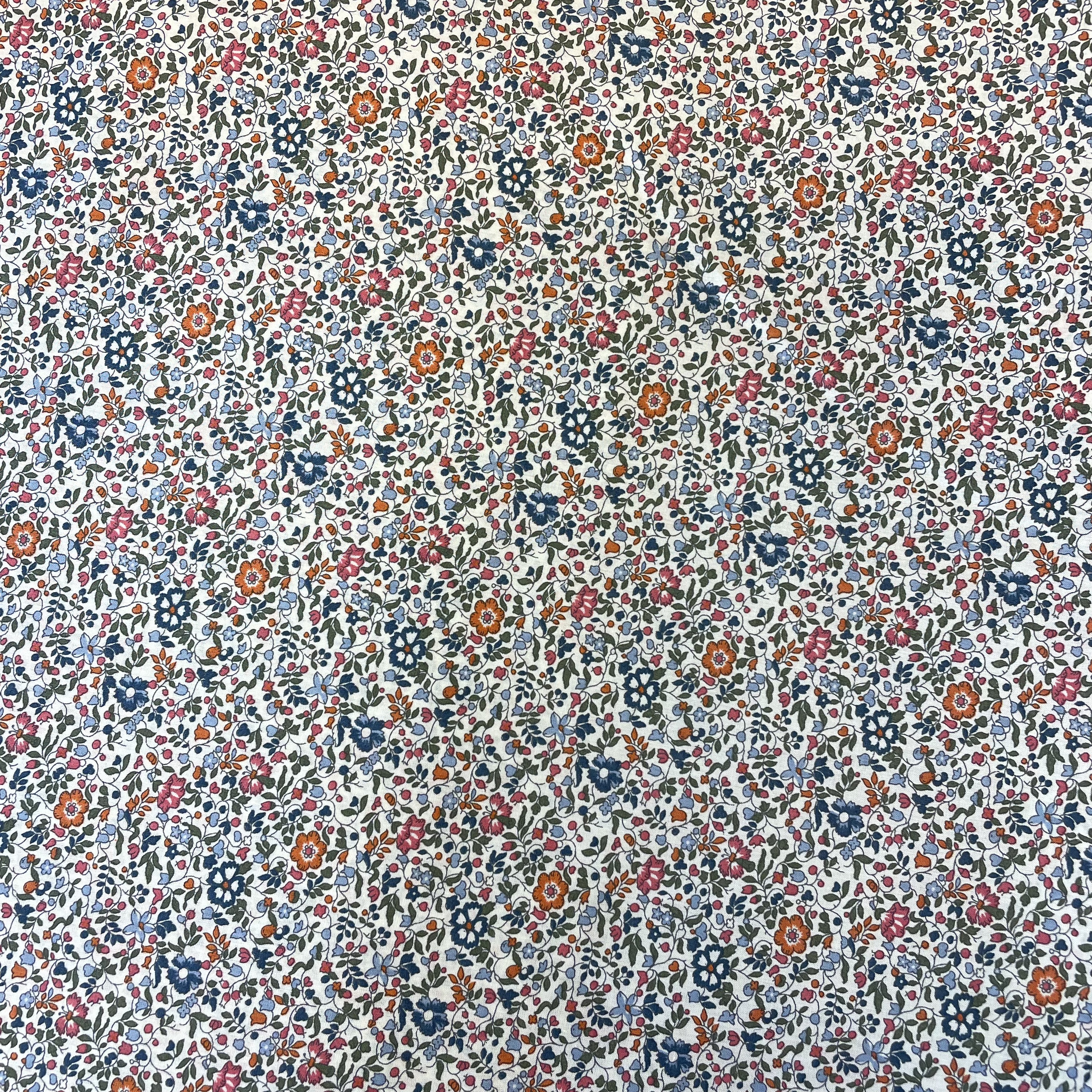 Smuk Liberty bomuld med små blomster i rosa, orange, blå og grøn på hvid baggrund.