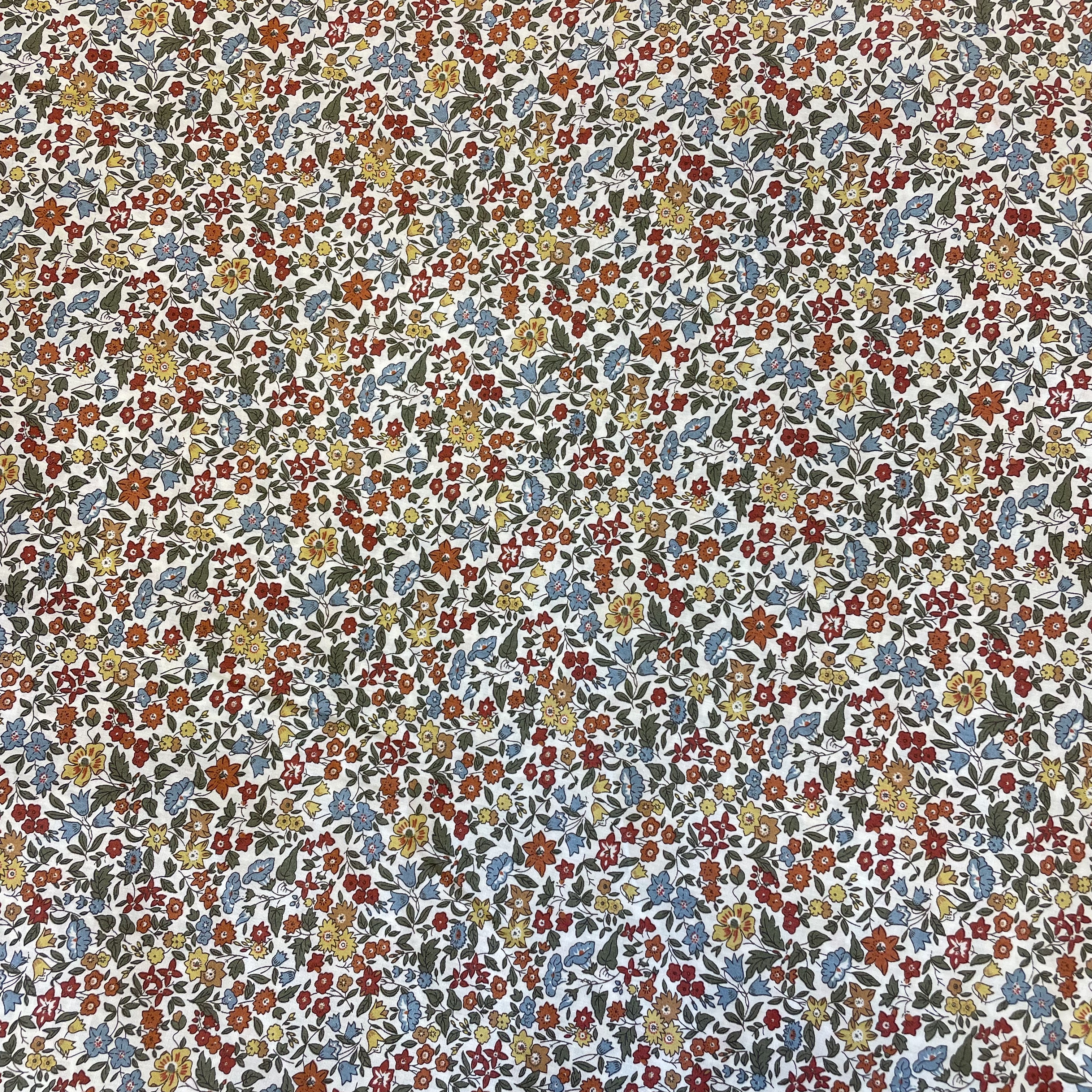Smuk Liberty bomuld med små blomster i karrygul, orange, blå og grøn på hvid baggrund.
