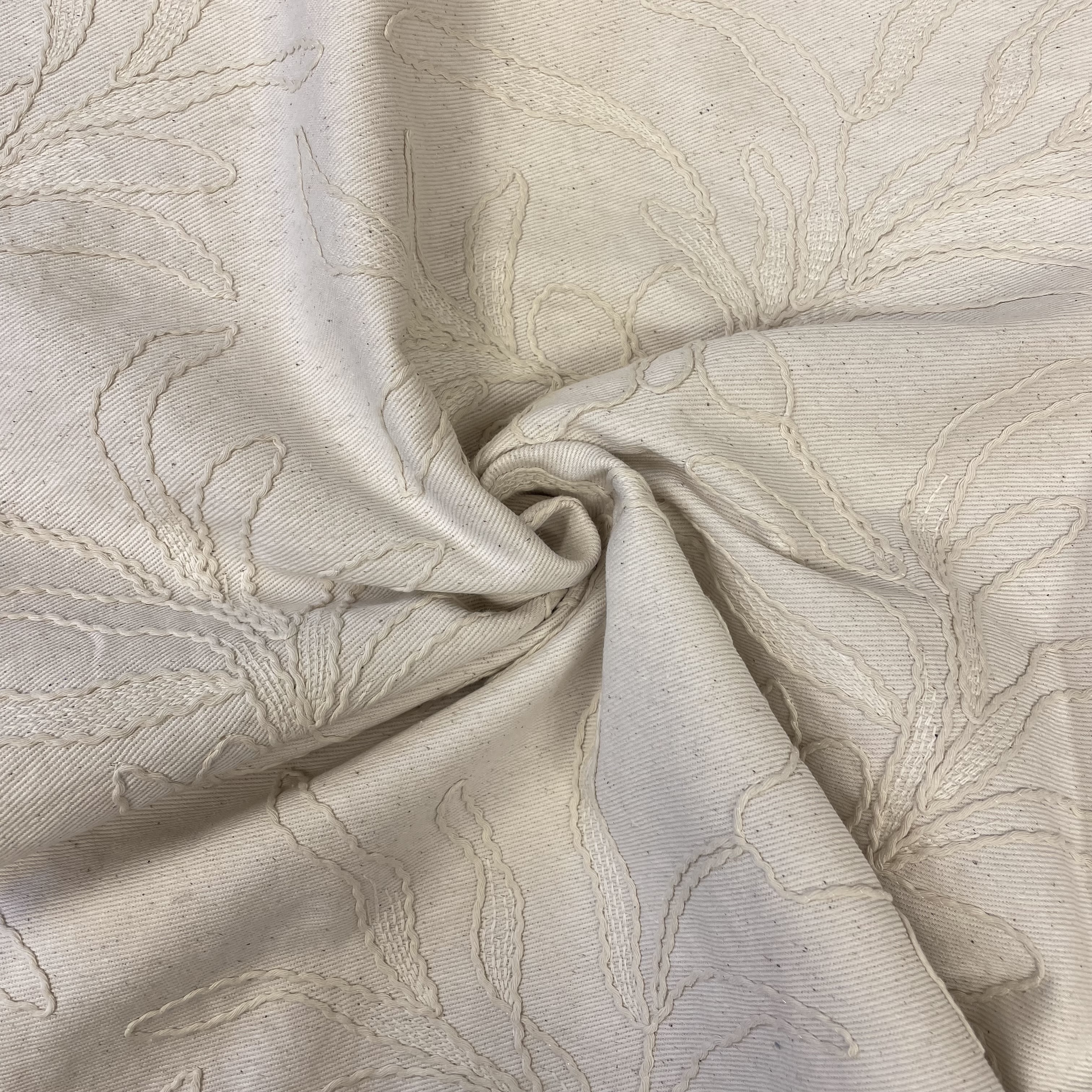 Canvas i bomuld med broderi i råhvid Brug dette stof til jakker, bukser, sofa- eller altanpuder
