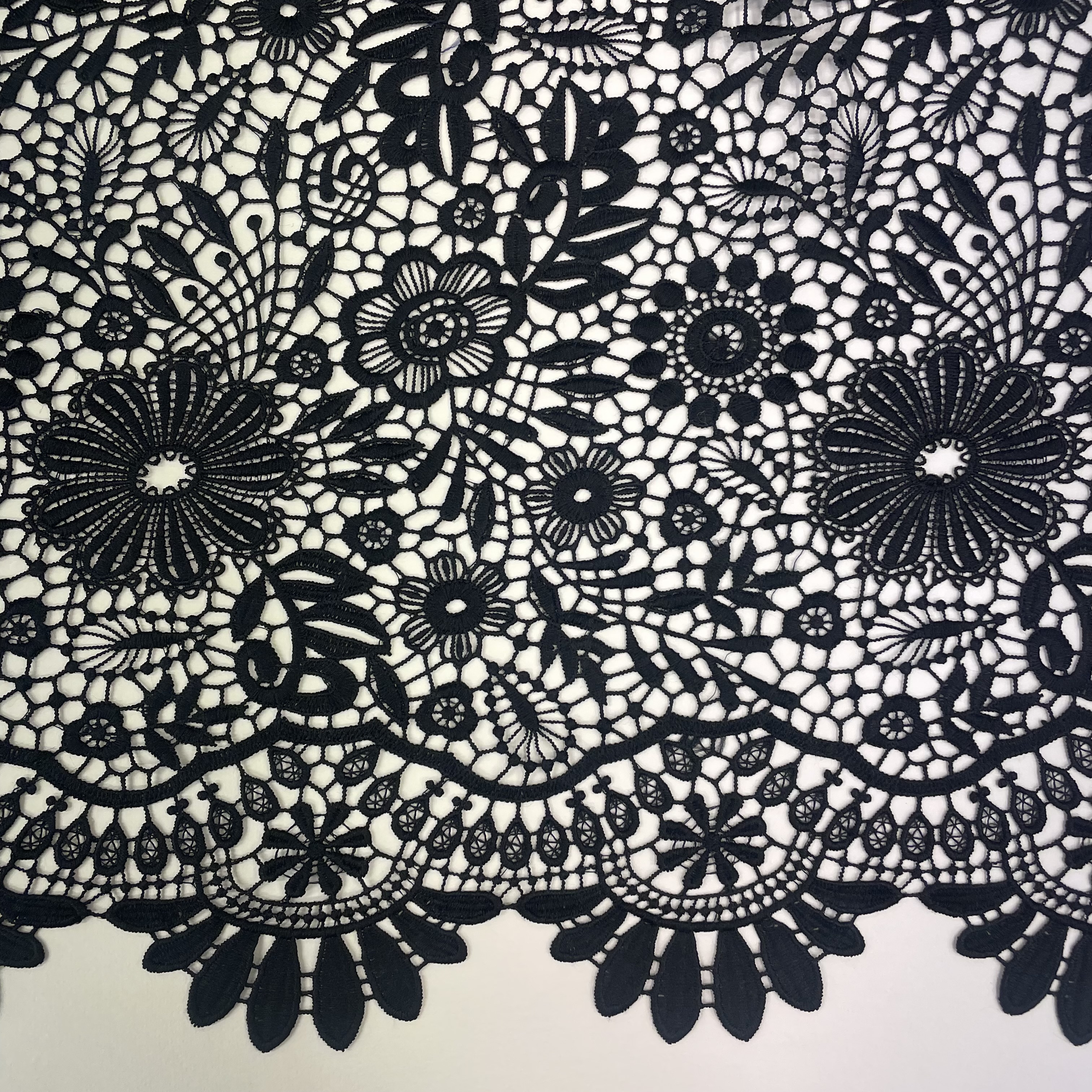 Smuk blonde fra italiensk modehus. Dette blondestof vil være meget velegnet til bluser og kjoler, eller måske til ærmer eller øverste del af et bærestykke. Stoffet er gennemsigtigt, og derfor vil et foer nedenunder ofte være nødvendigt.