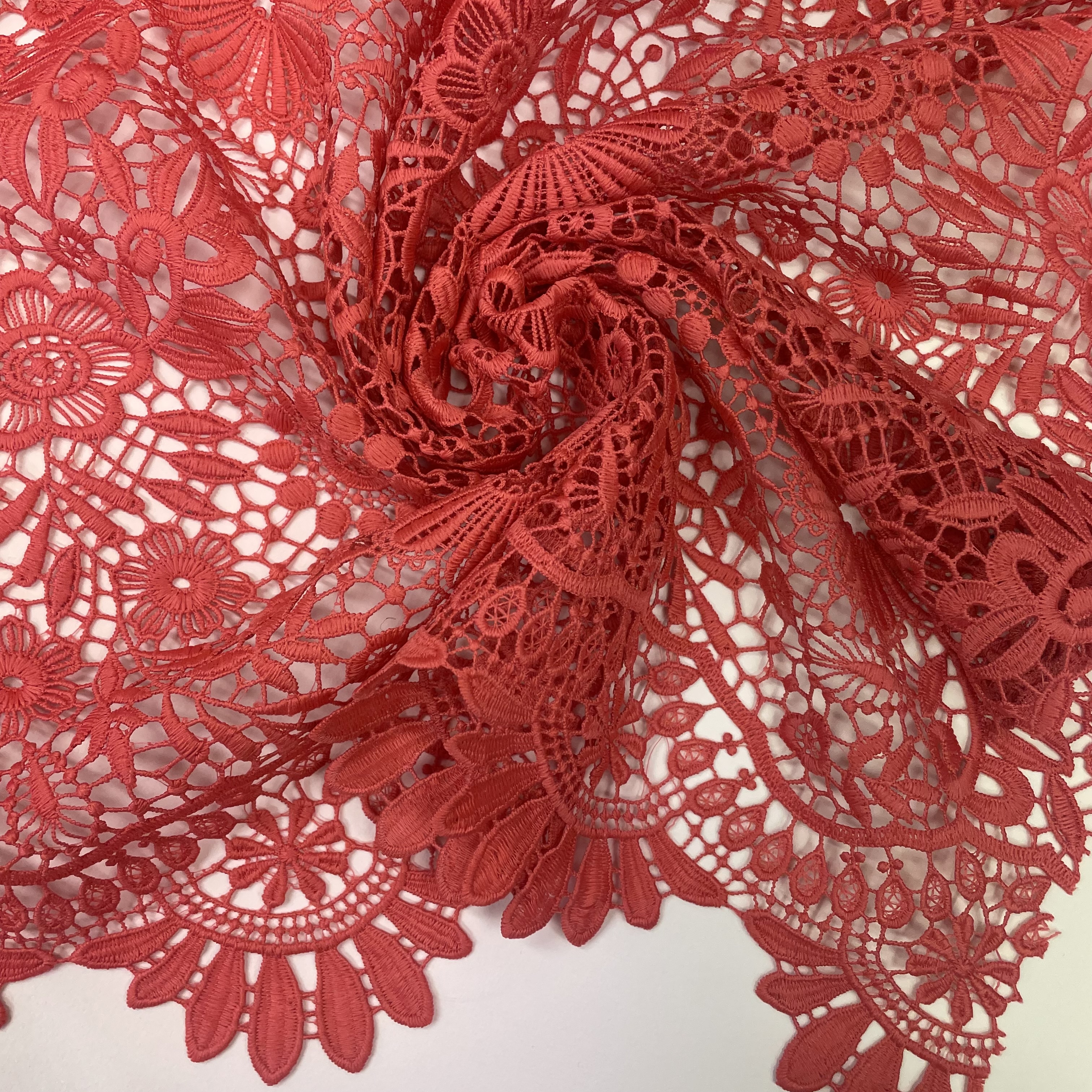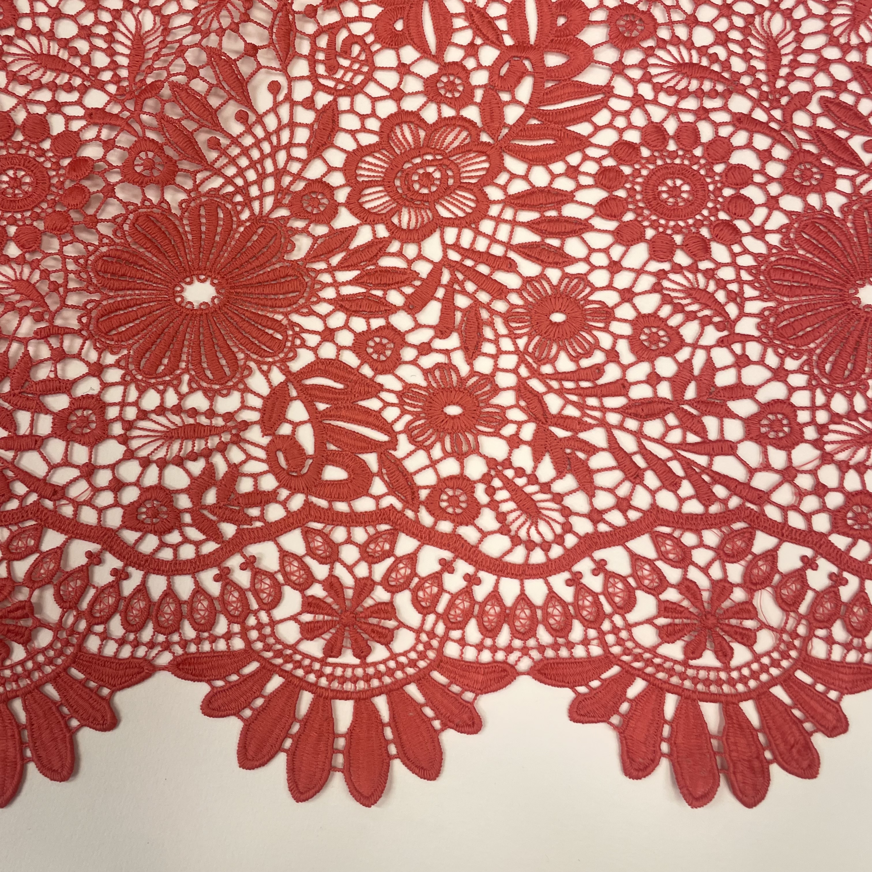Smuk blonde fra italiensk modehus. Dette blondestof vil være meget velegnet til bluser og kjoler, eller måske til ærmer eller øverste del af et bærestykke. Stoffet er gennemsigtigt, og derfor vil et foer nedenunder ofte være nødvendigt.