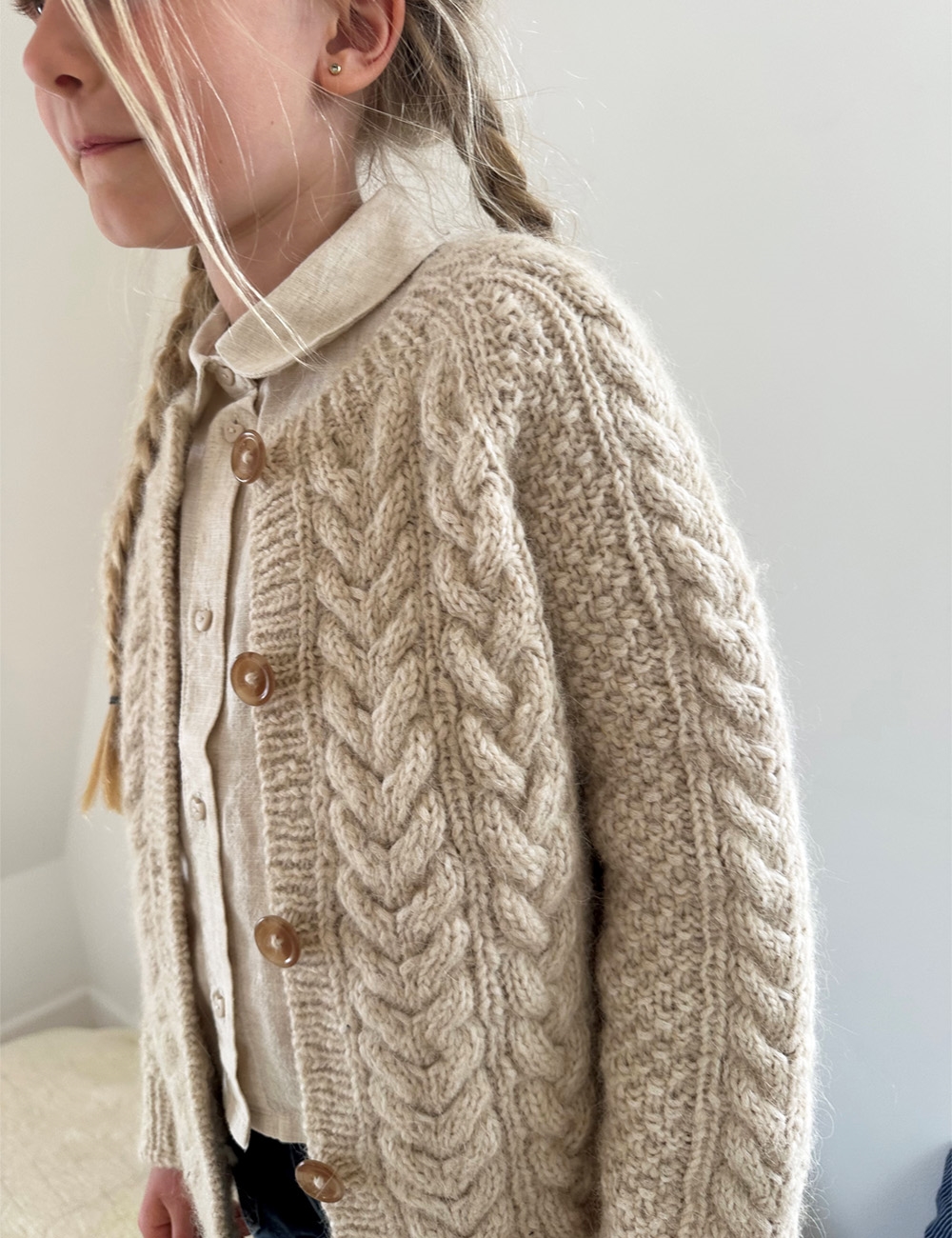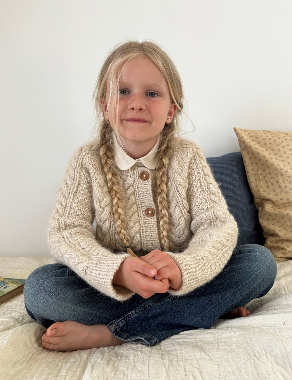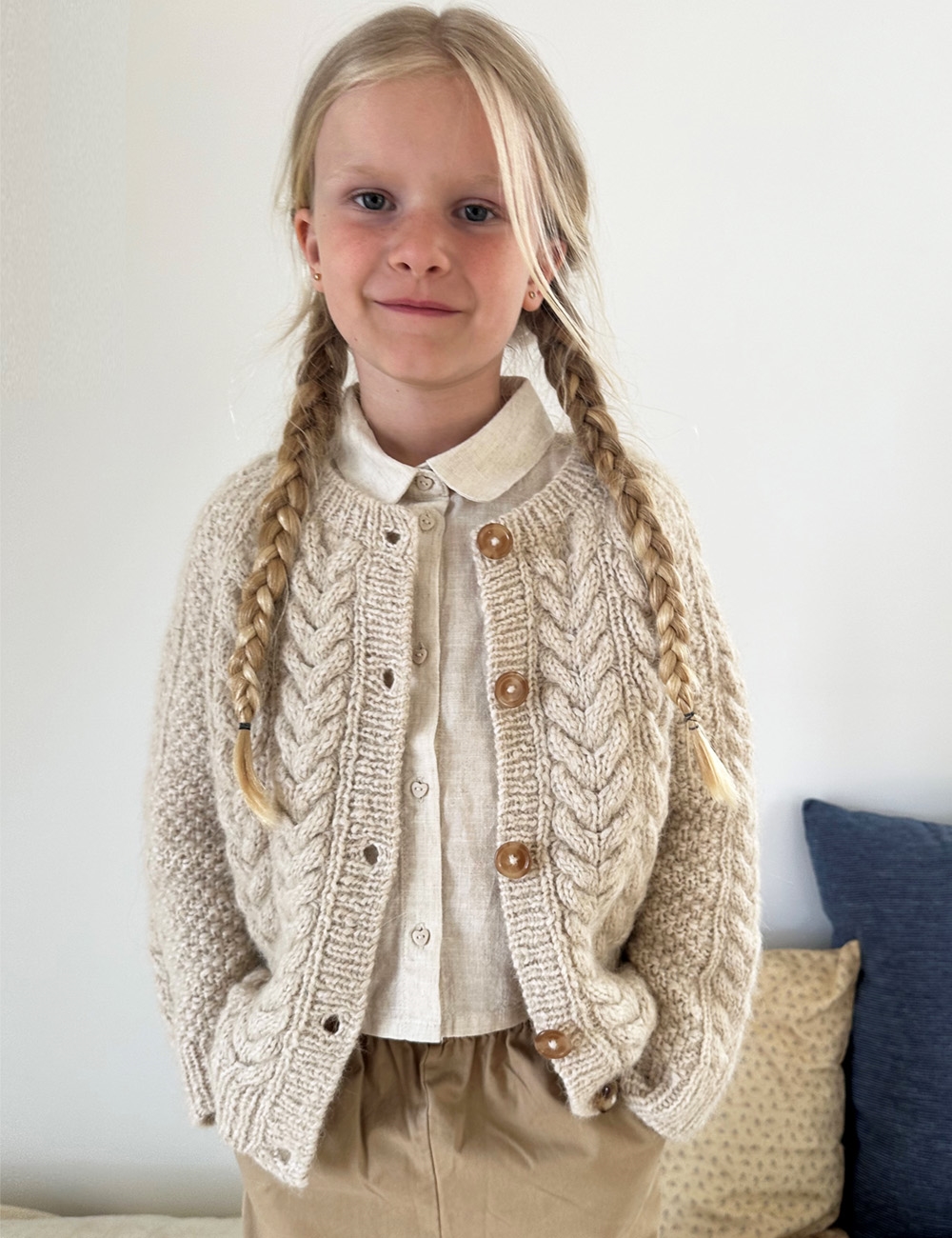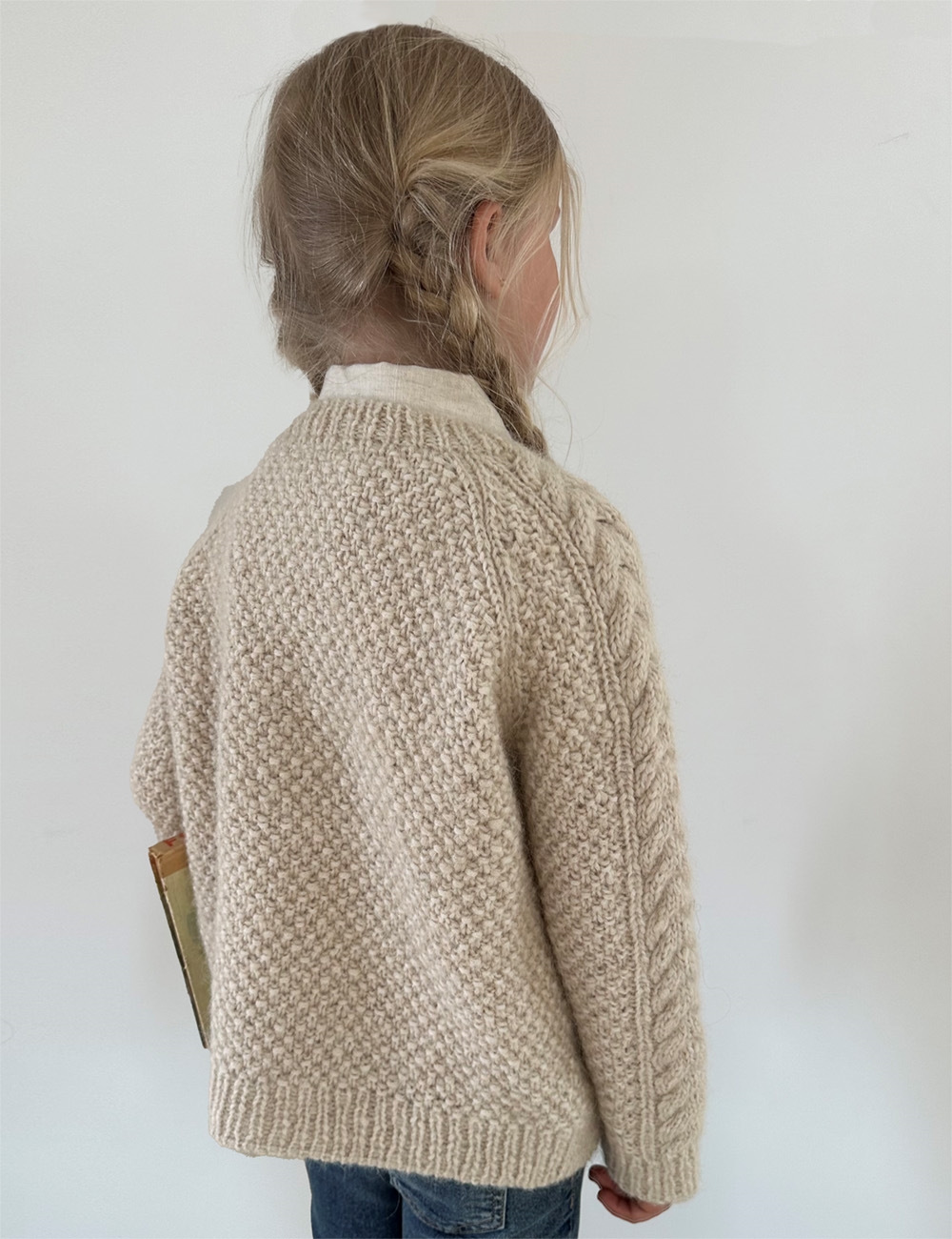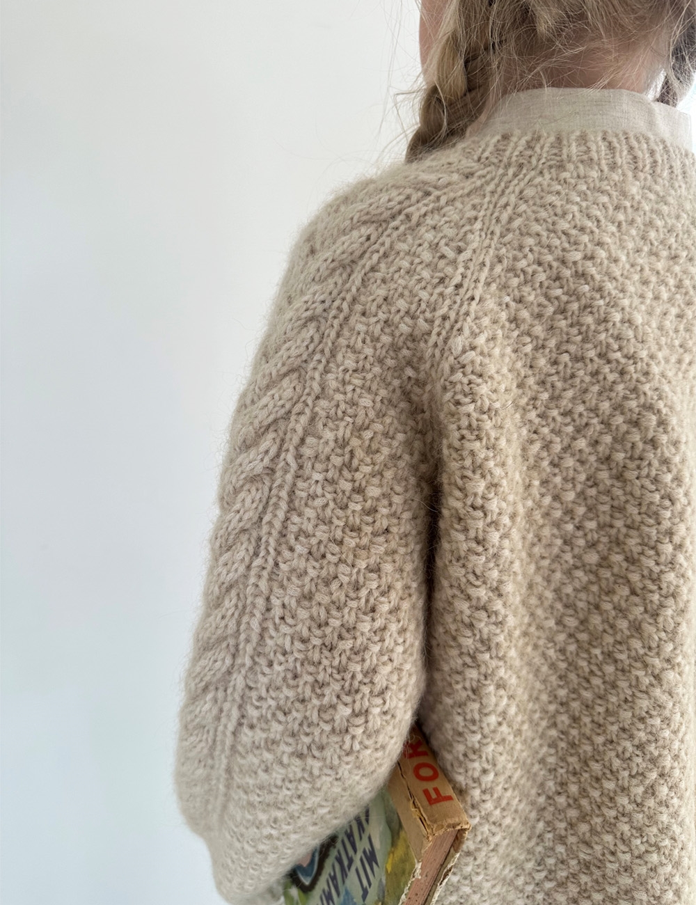 Siri Cardigan junior er et overskueligt projekt med snoninger. De få, men velplacerede, snoninger er nemlig kombineret med et lille nemt mønster i dobbelt perlestrik, der bliver fint og fyldigt i både blowgarn og i en kombination af uld og mohair. Siri Cardigan junior har en snoning midt på hvert ærme og to snoninger på hvert forstykke. Ryggen er strikket udelukkende i dobbelt perlestrik.