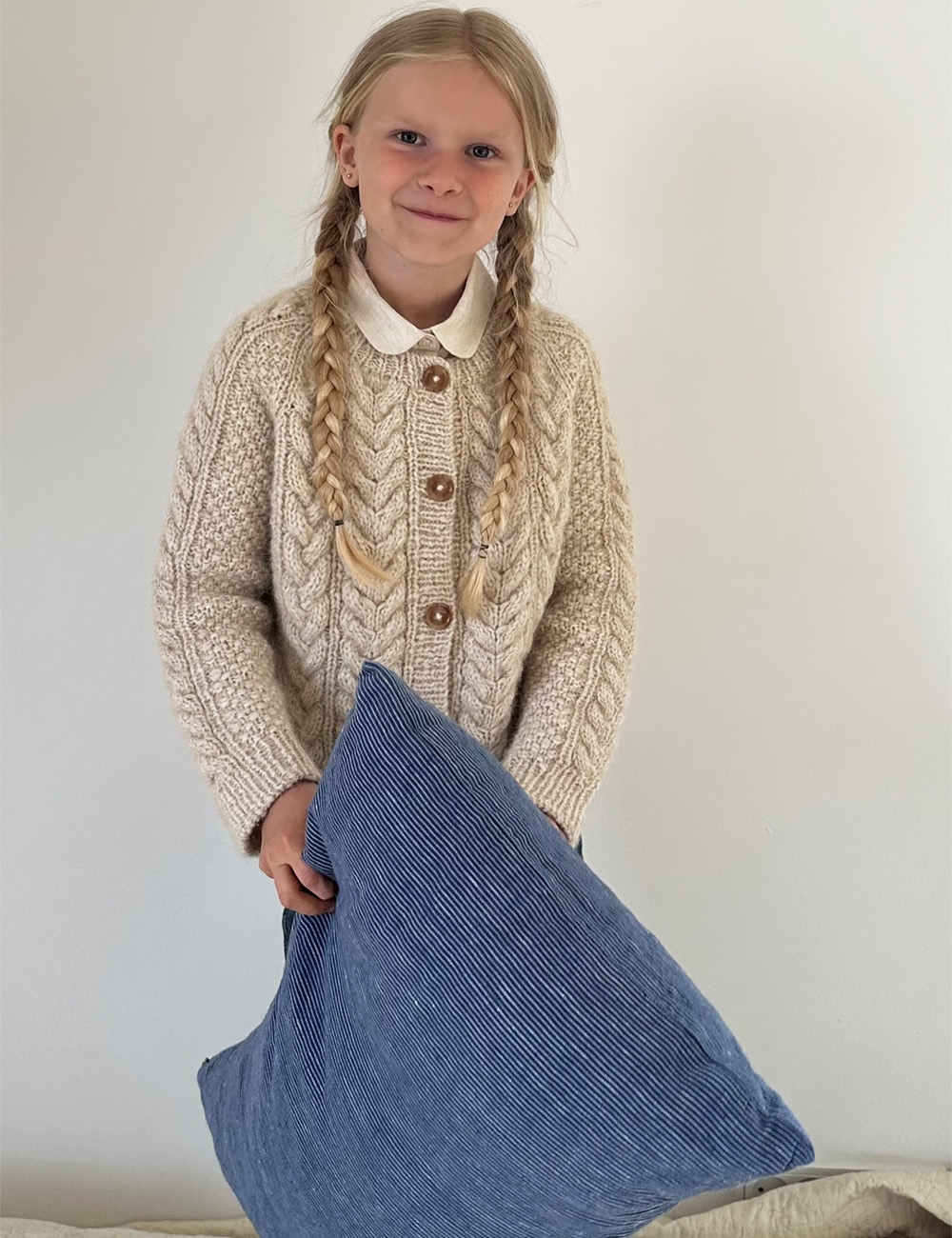 Siri Cardigan junior er vist her med et bevægelsesrum på ca. 22 cm. Find barnets overvidde ved at måle det om brystet (eller overkroppens største mål). Se derefter på målene først i opskriften (dette er trøjens færdige mål). Bevægelsesrum (positive ease) er forskellen mellem det personlige mål og trøjens mål. Er barnets overvidde f.eks. 61 cm, vil en str. 6-7 år give et bevægelsesrum på 25 cm (87 cm – 62 cm = 25 cm).