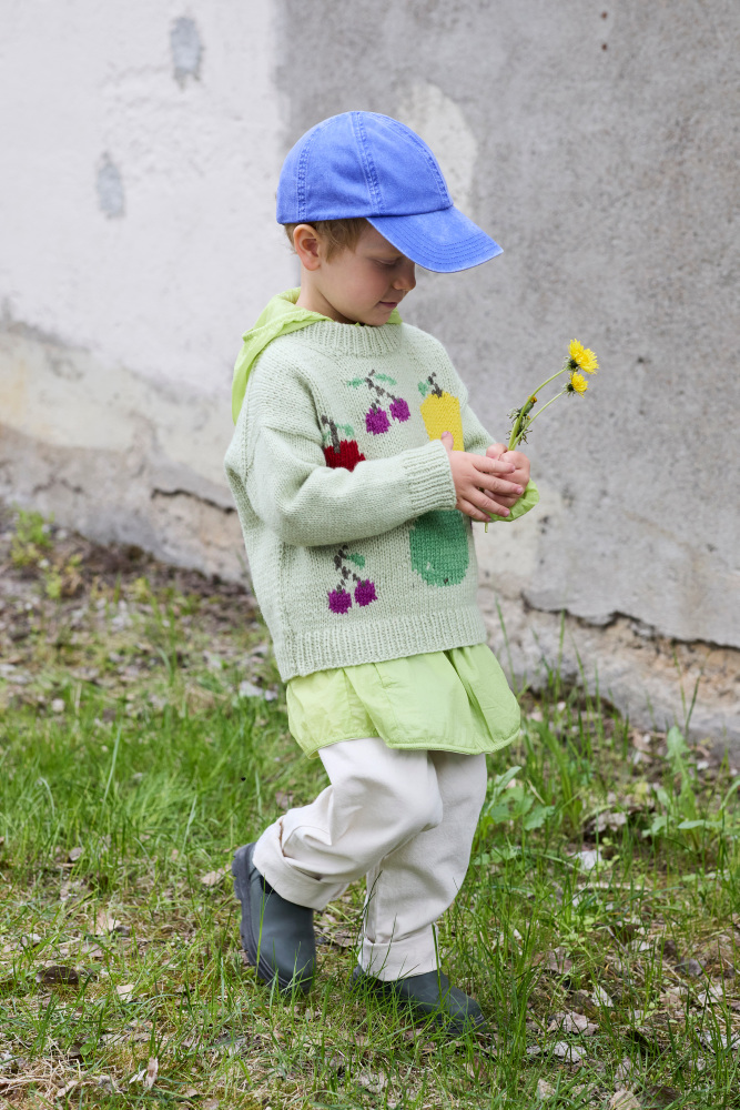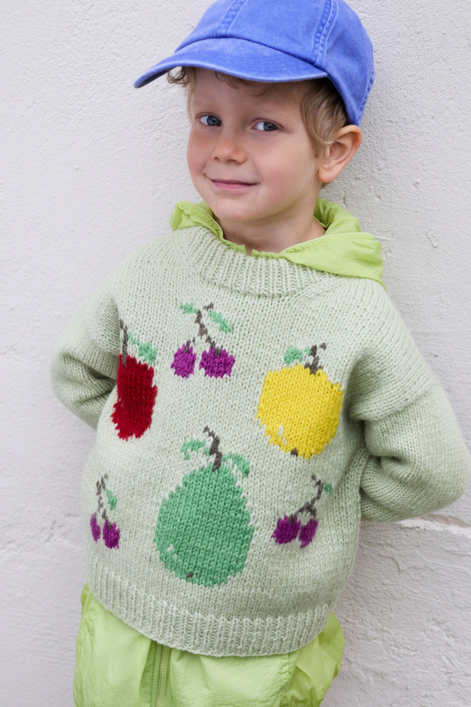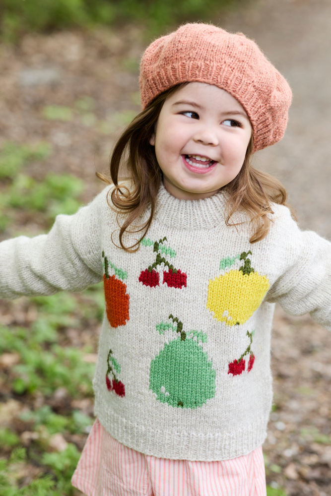 Rauma hæfte 437 Fruktig Intarsia, er et fint hæfte til børn, hvor der er skruet op for leg og farver! Kollektionen er inspireret af barndommens yndlingsstrik – den hue eller trøje, der altid kom med på eventyr. Her finder du opskrifter med frugtmotiver, klare farver og intarsia som kreativ teknik – perfekt til dig, der har lyst til at prøve kræfter med mønsterstrik uden lange tråde på bagsiden.
