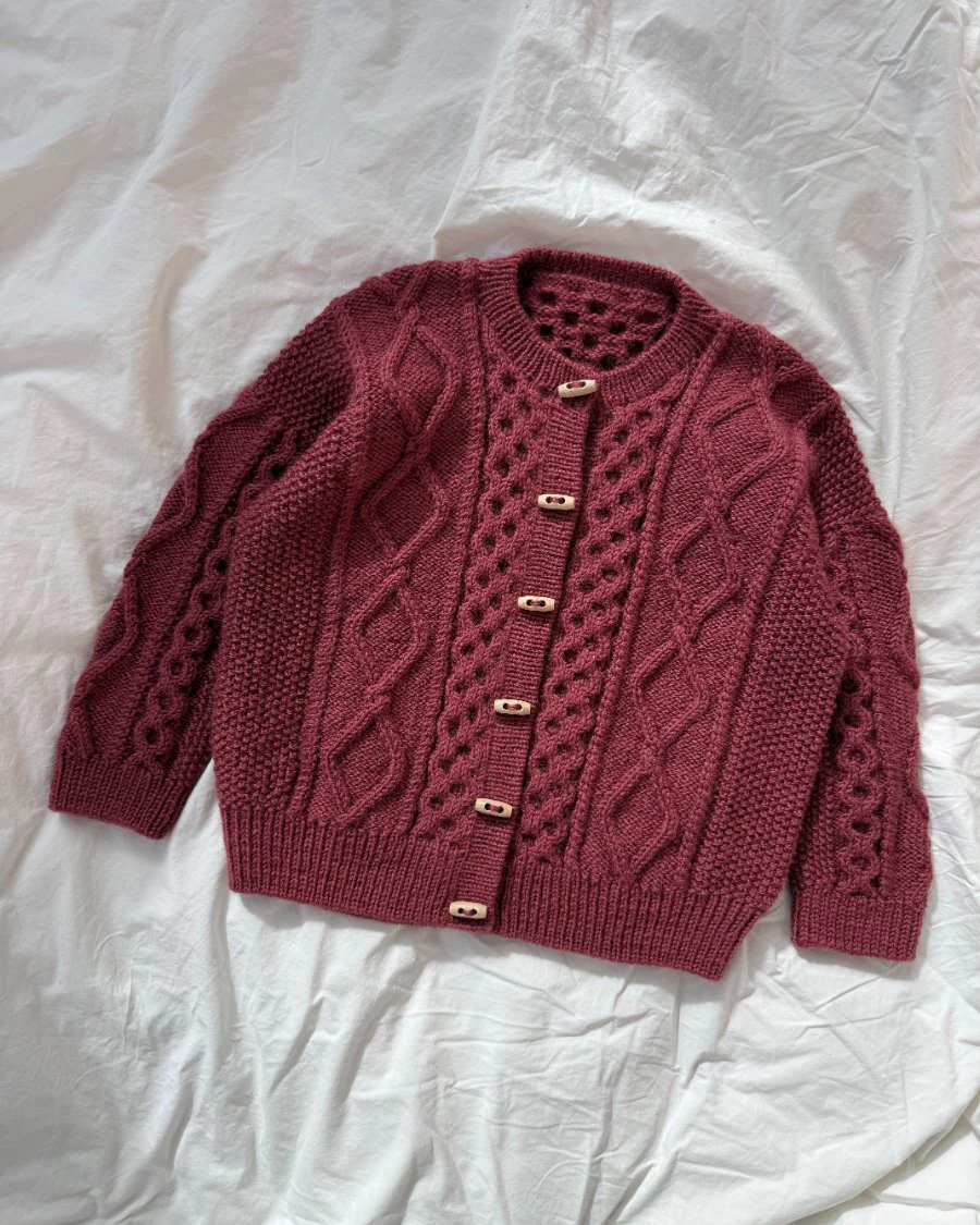 Den bordeaux Dagmar Jacket Junior er strikket i Peer Gynt fra Sandnes Garn i farven Sienna [4253].