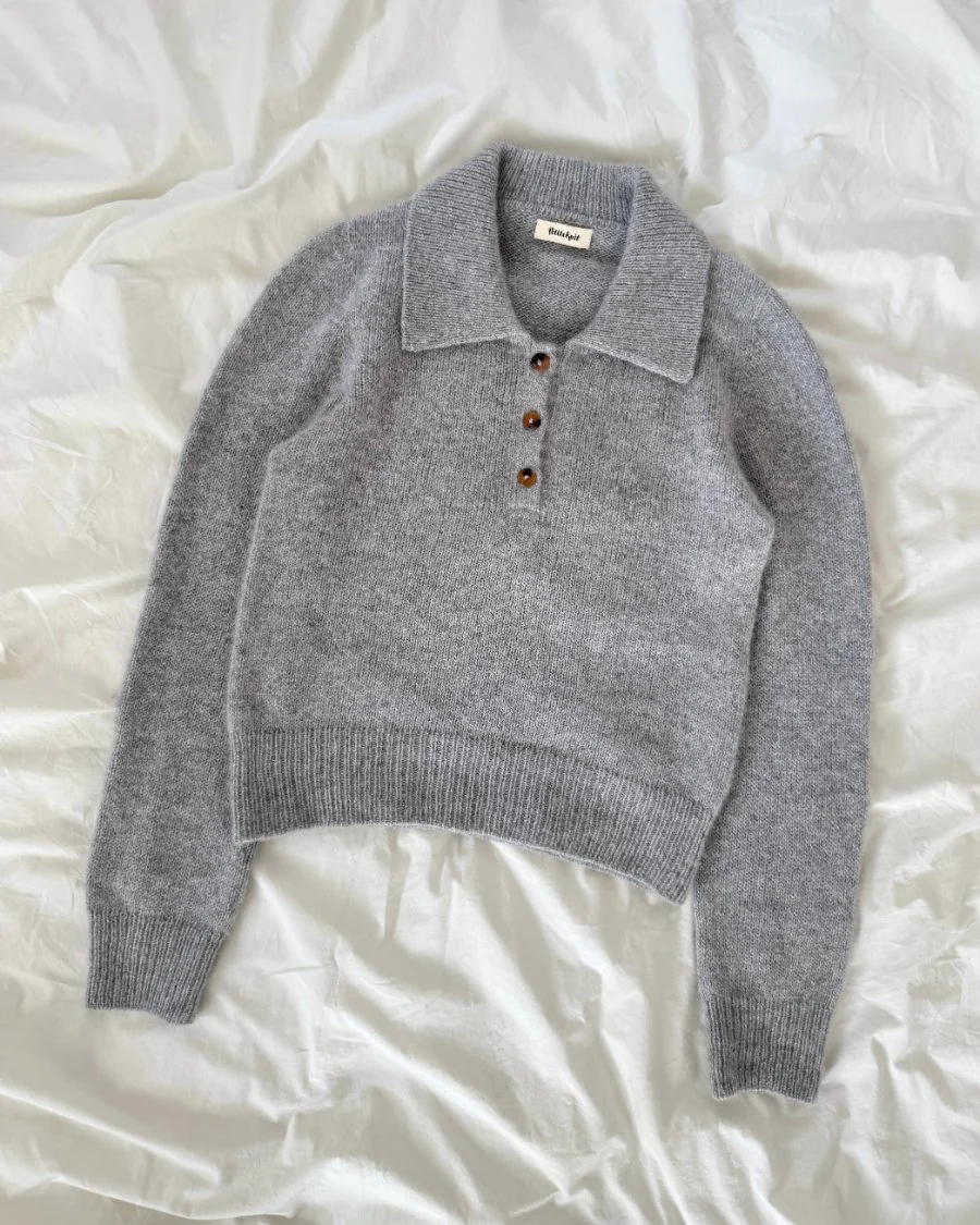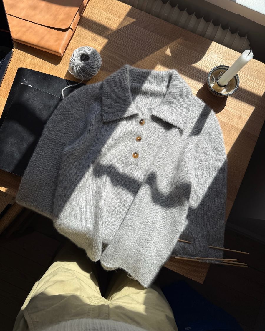 Den grå Petra Polo er strikket i Cashmere fra Sandnes Garn i farven Grey melange [1042].