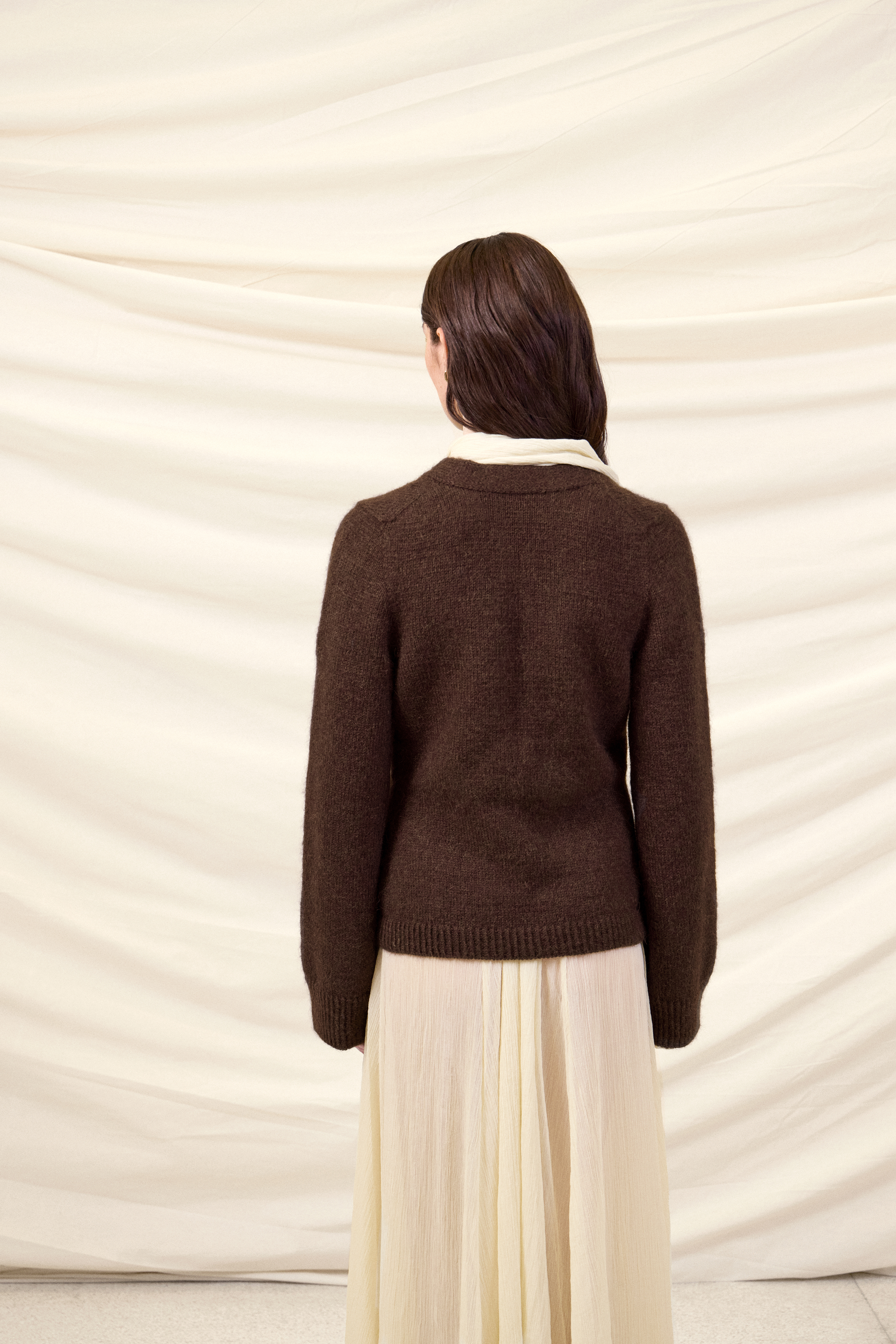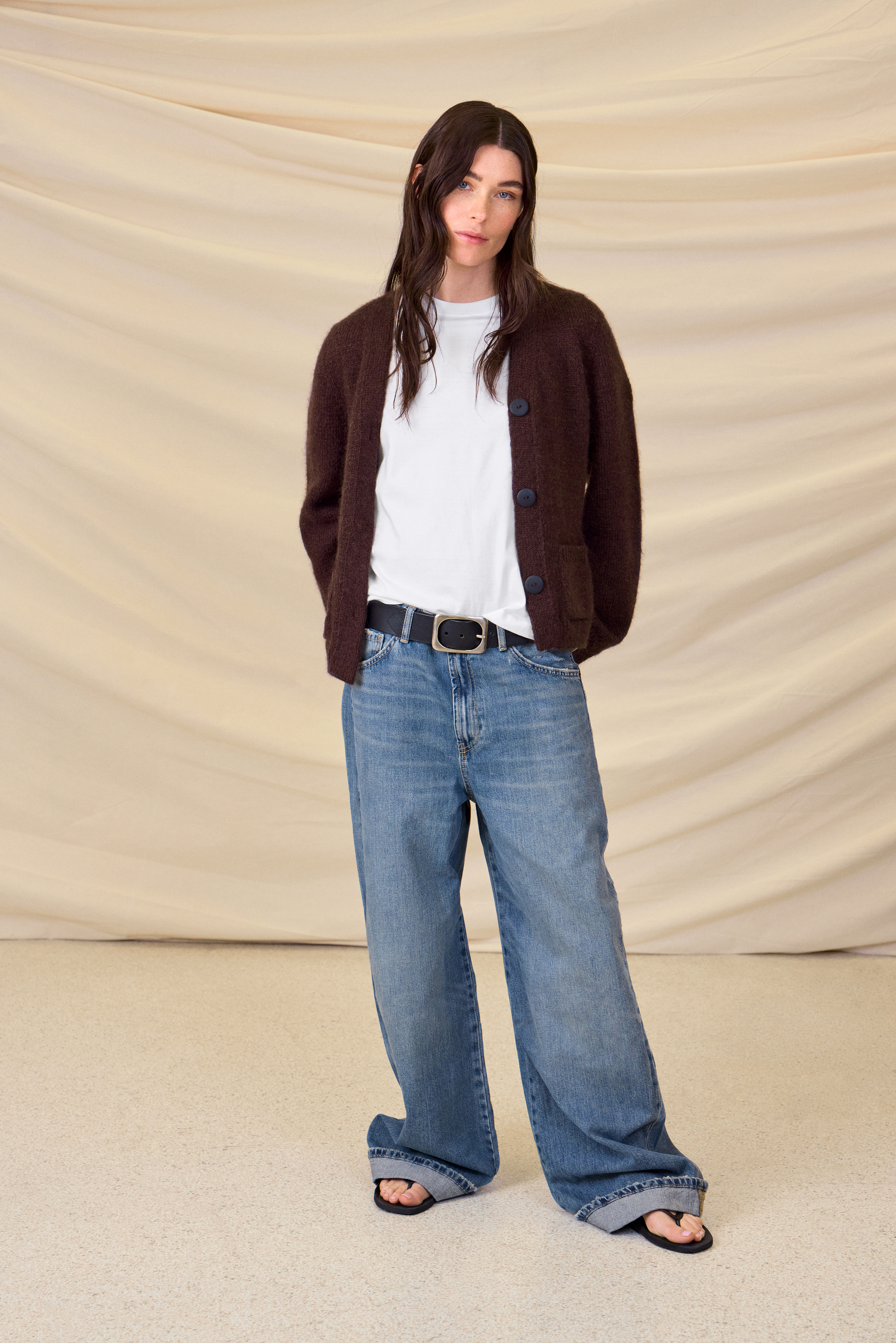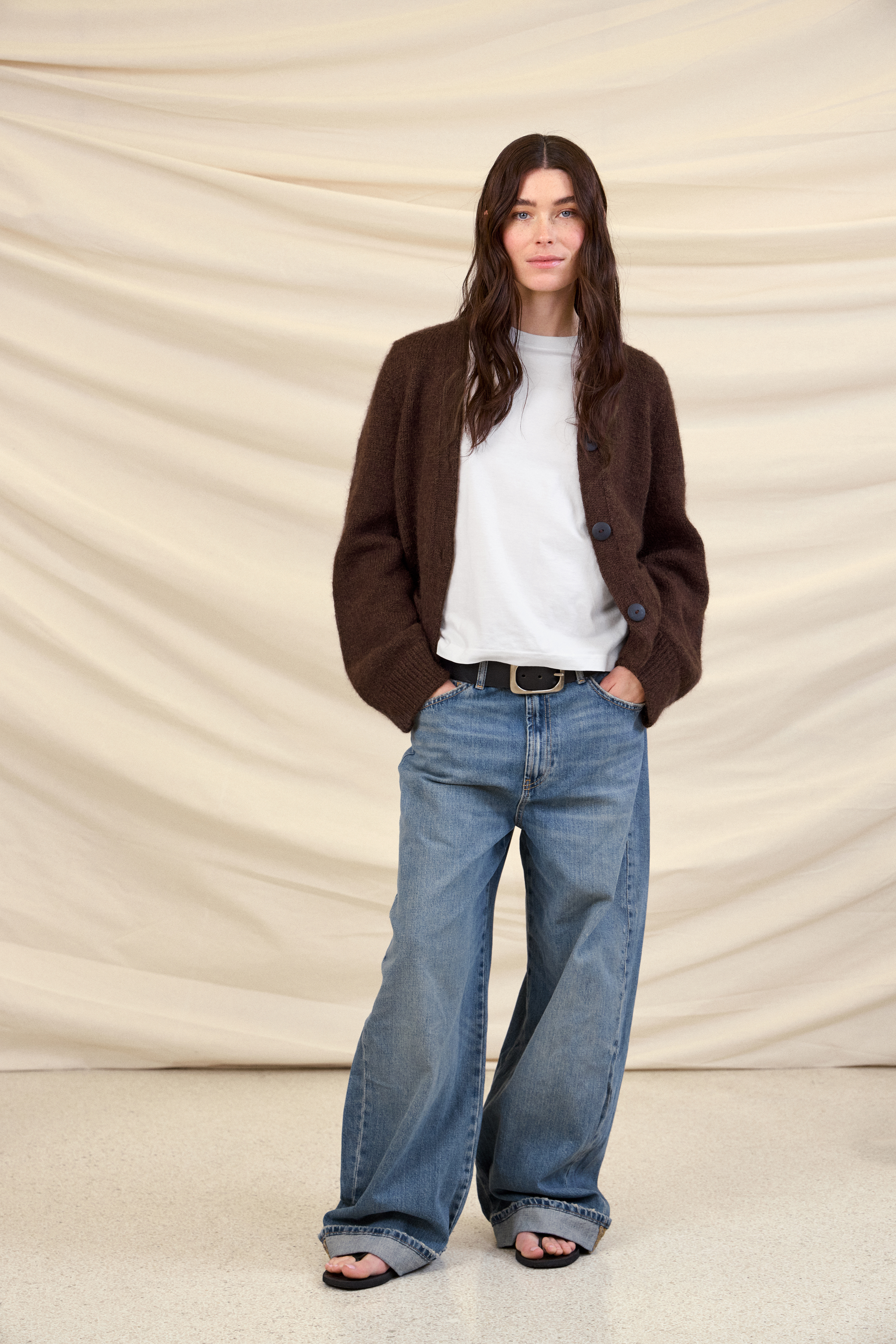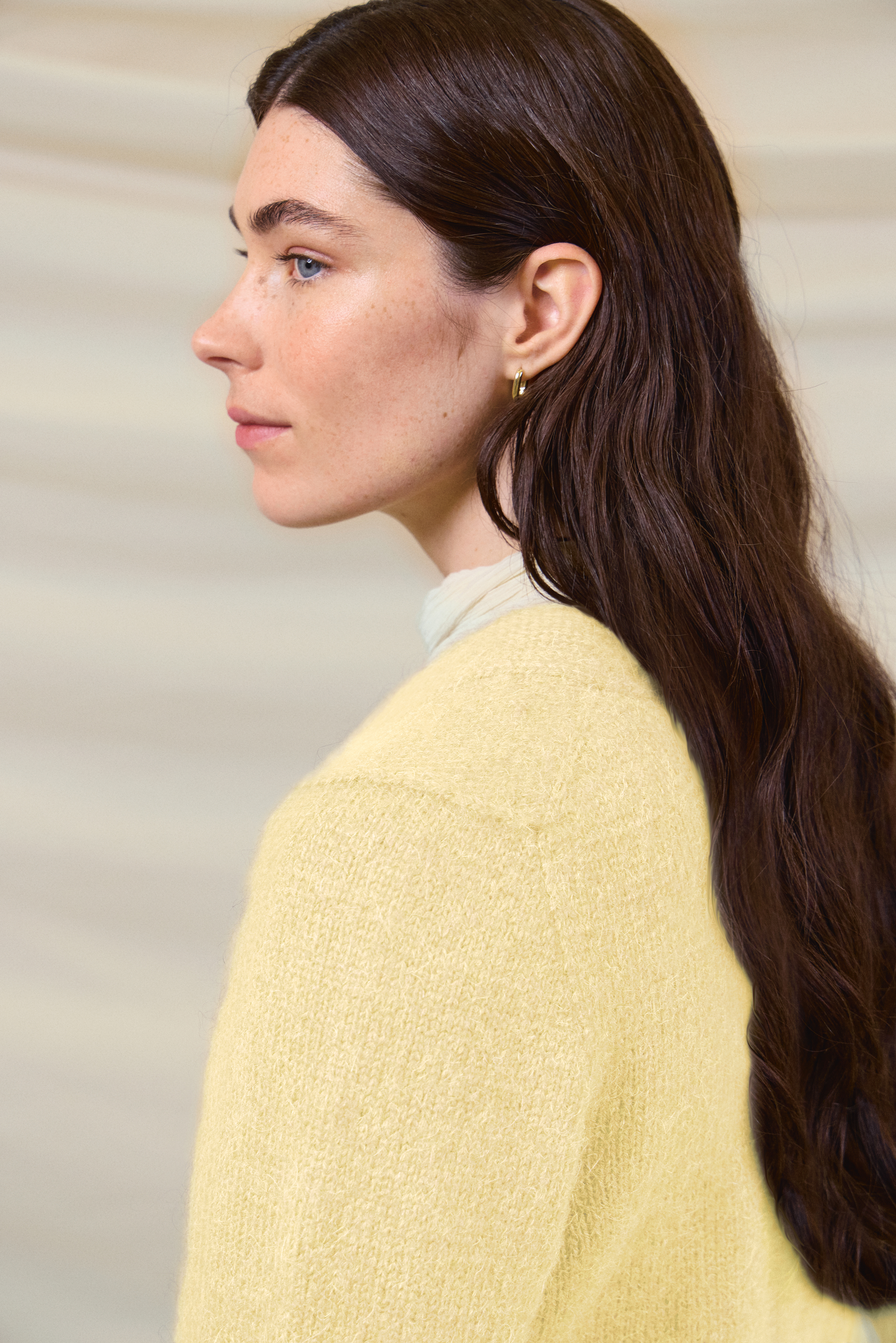 Jakken strikkes oppefra og ned i Alpakka Ull + Tynn Silk Mohair, som tilsammen giver en blød, lun og let kvalitet med et eksklusivt udtryk.