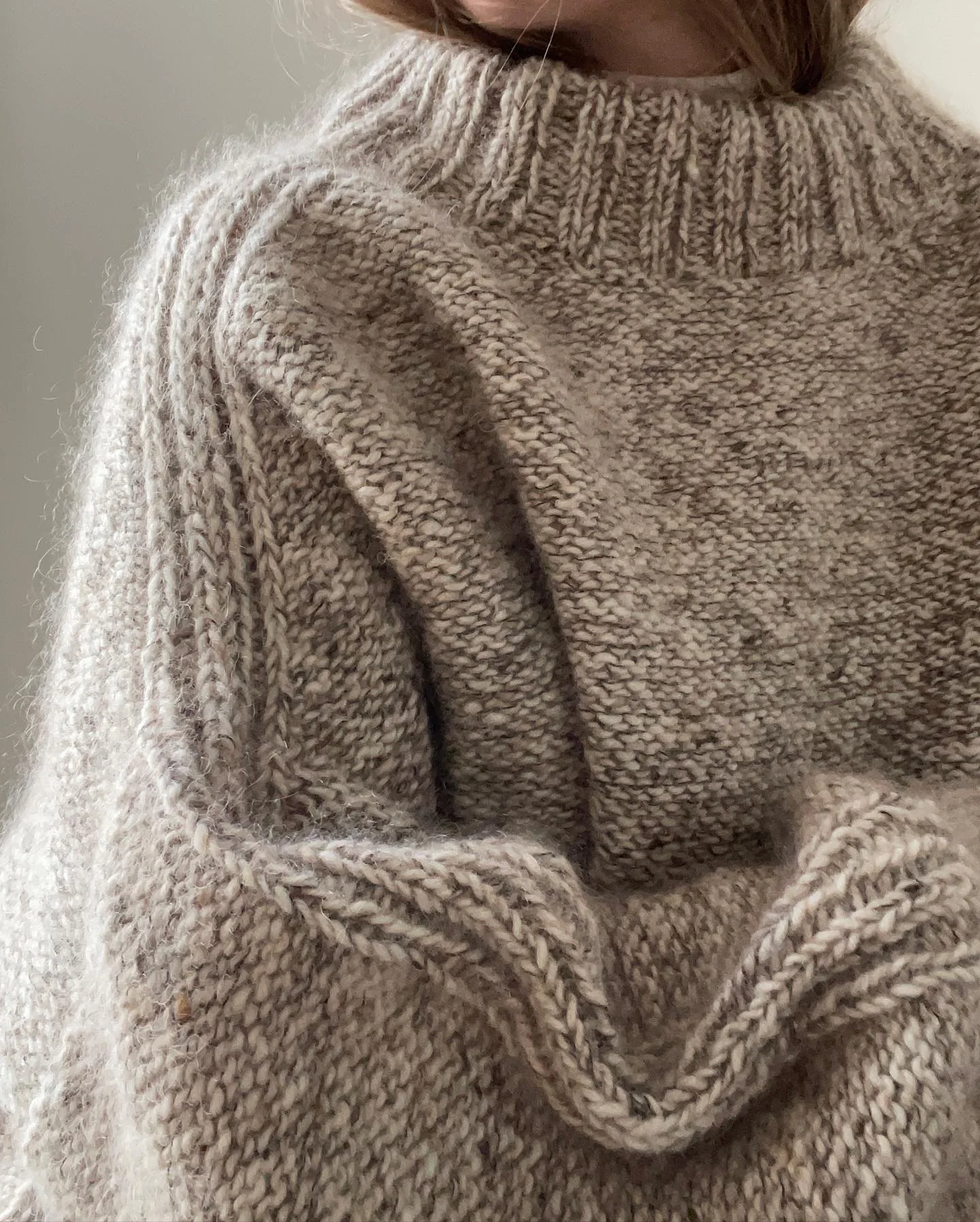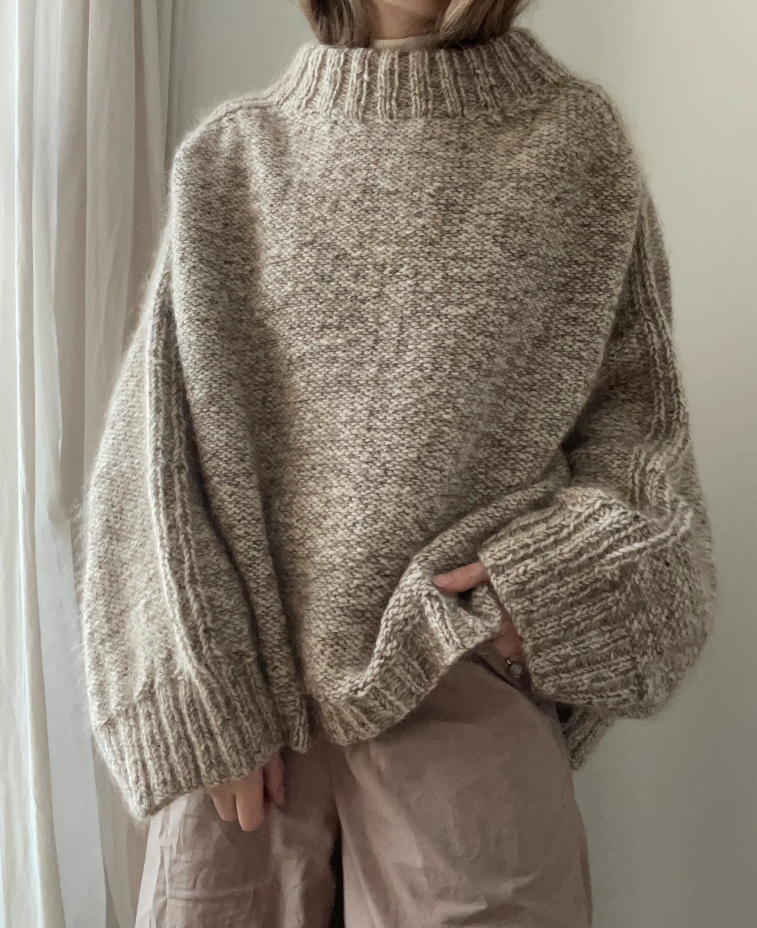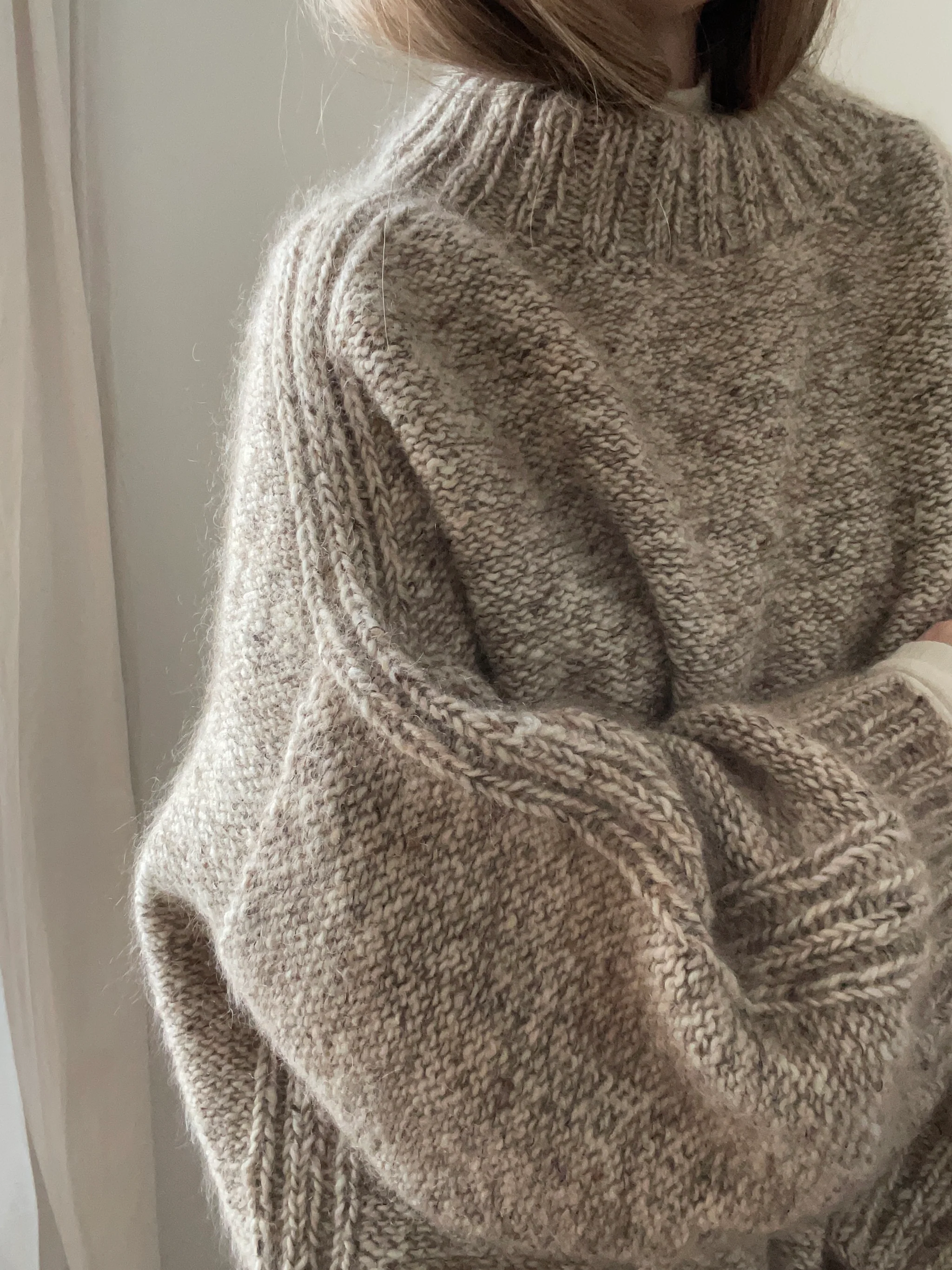 Bawi er den ultimative oversize sweater i en lækker tyk aran tweed garn, som er med til at gøre den til perfekte overgangssweater. Brug den som en jakke udover andet strik eller som det perfekte statement-piece i din garderobe. Sweateren strikkes oppefra og ned, der tages ud langs skulderen, og for og bag stykke strikkes langs ærmegabet hver for sig. Blusen strikkes med ”retsiden” ud for at undgå for mange vrangmasker.