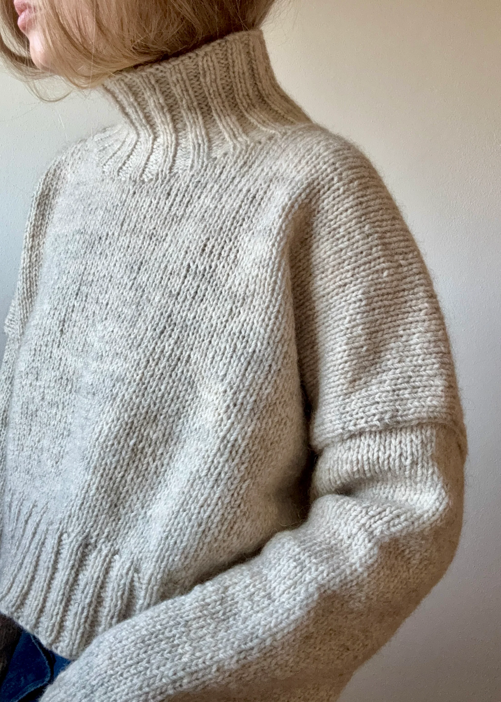 Jeg har en størrelse 2 på, på mine billeder for et meget oversized udtryk, svarende til en rørlig vidde på 61 cm. Derudover er min prototype strikket med kortere længde på kroppen, dette kan justeres efter behov og præference undervejs. Jeg er 160 cm høj og min sweaters længde bagtil måler fra nakke til bund: 46 cm.