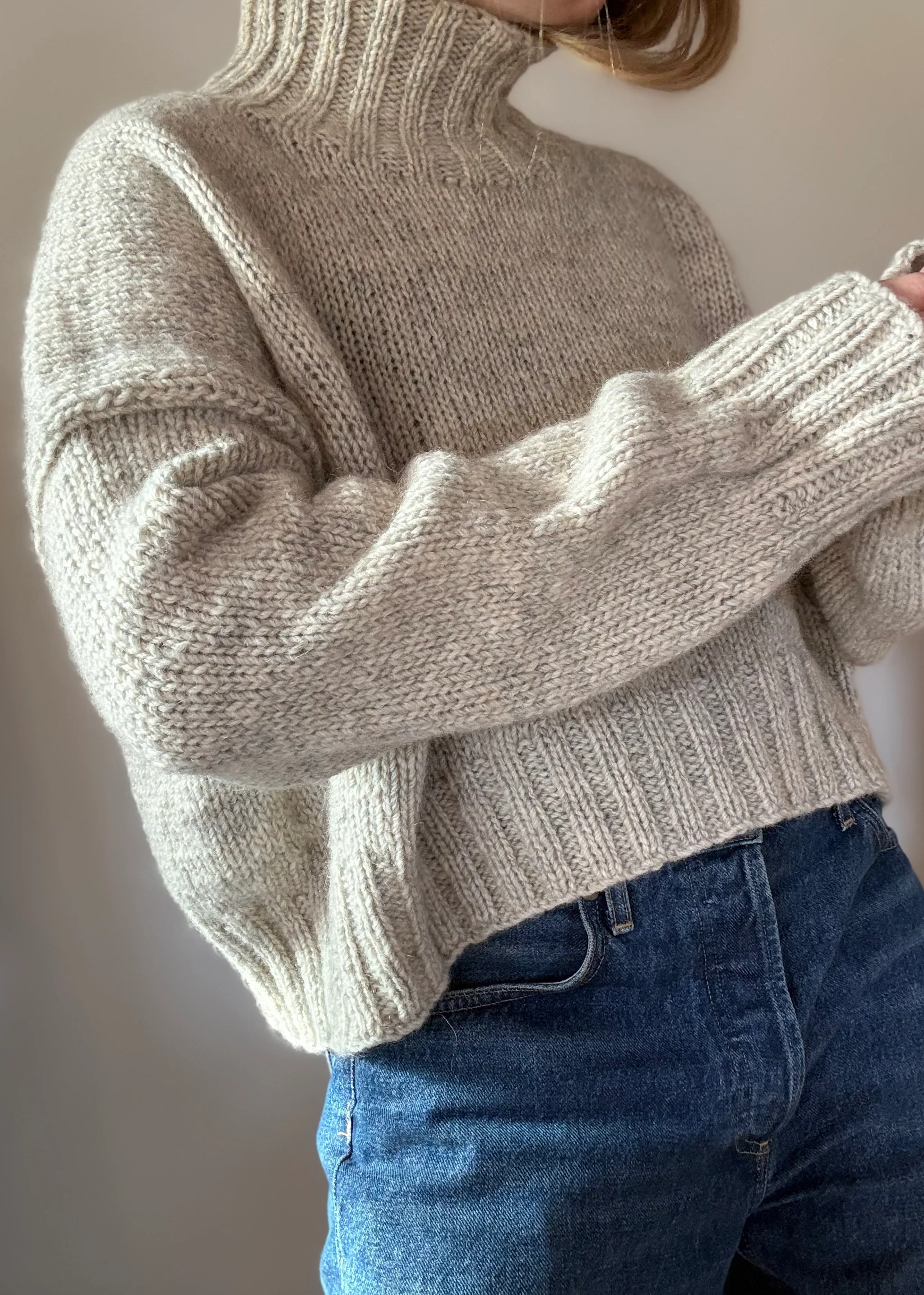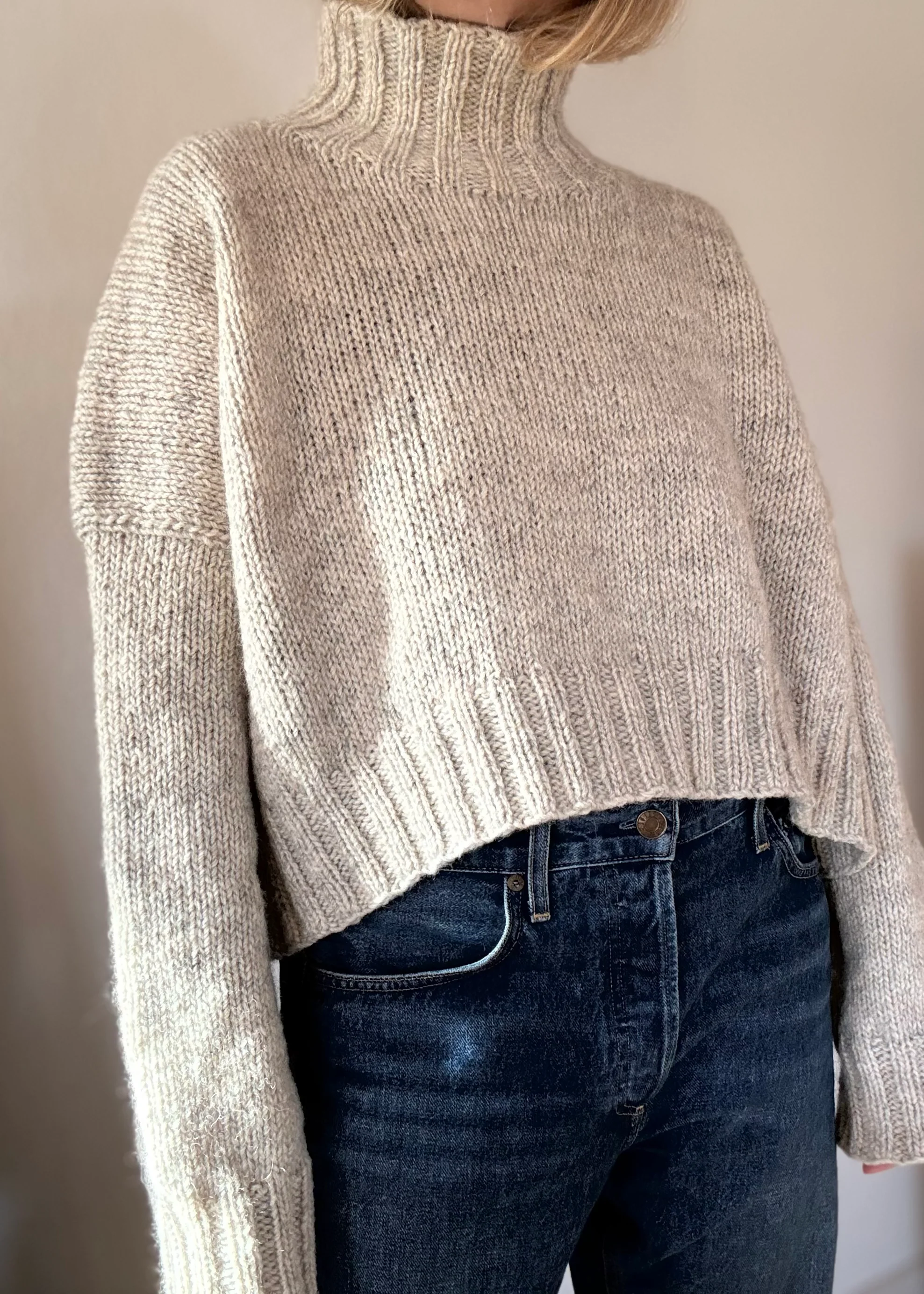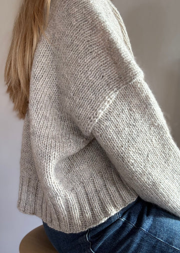 Hana er en sweater med en rumlig og kort silhuet, som gør den elegant og enkel til hverdagsbrug. Jeg har strikket den i en kraftig og rustik uld, der giver god tyngde og varme grundet uldens naturlige varmeegenskaber. Hana strikkes oppefra- og ned og er glatstrikket, der afsluttes med en feminin rundet hals i dobbeltrib.