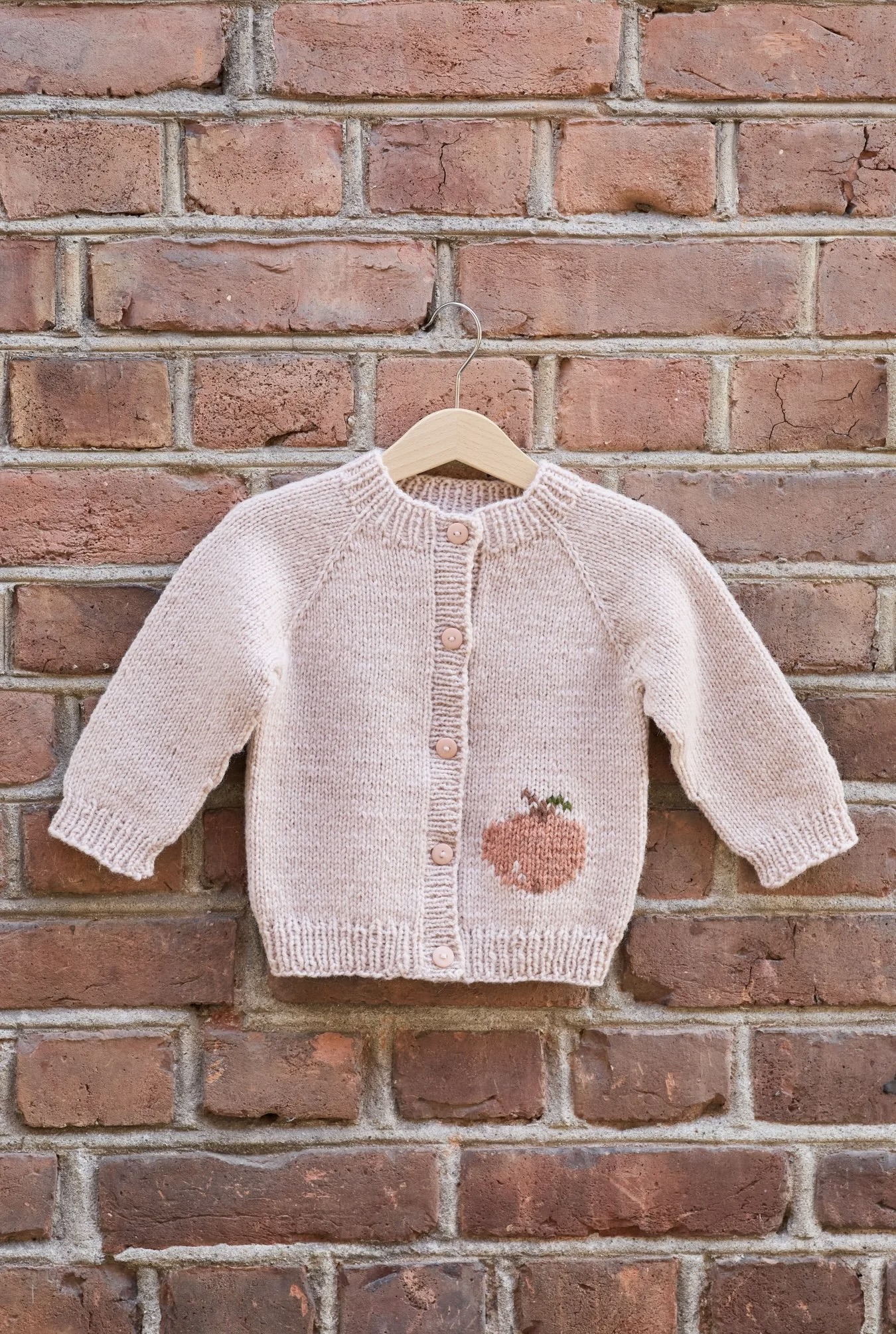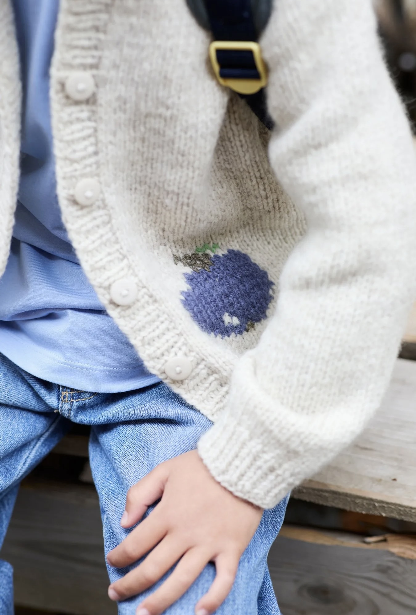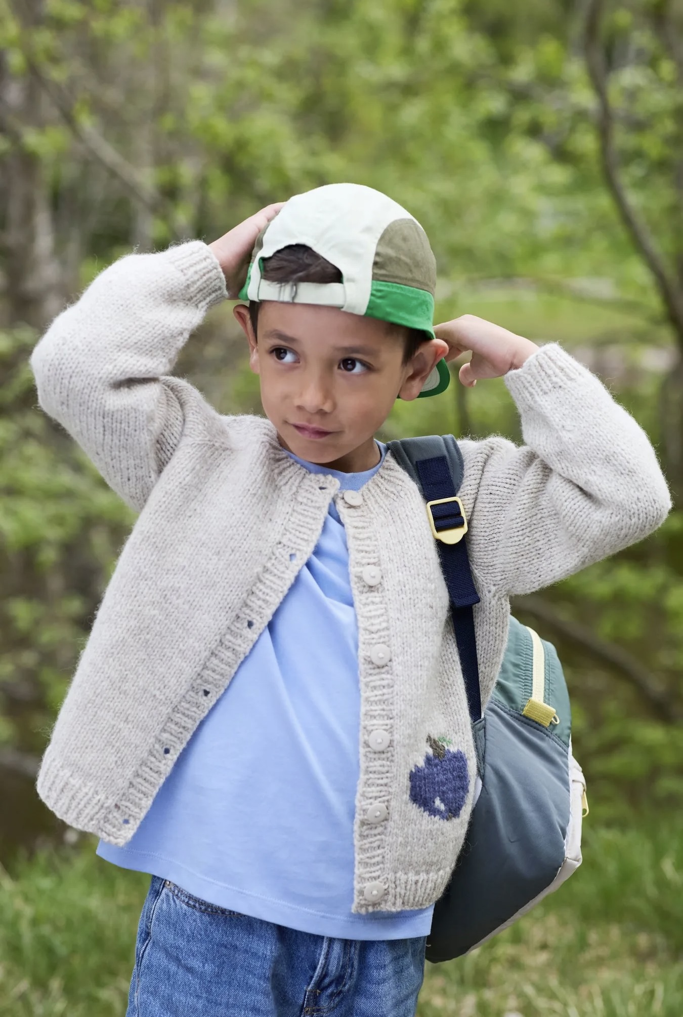 Frugtjakke er en enkel, glatstrikket jakke med kanter i 1x1 rib og et sødt æblemotiv strikket i intarsiateknik. Jakken har en klassisk pasform og strikkes frem og tilbage, oppefra og ned.