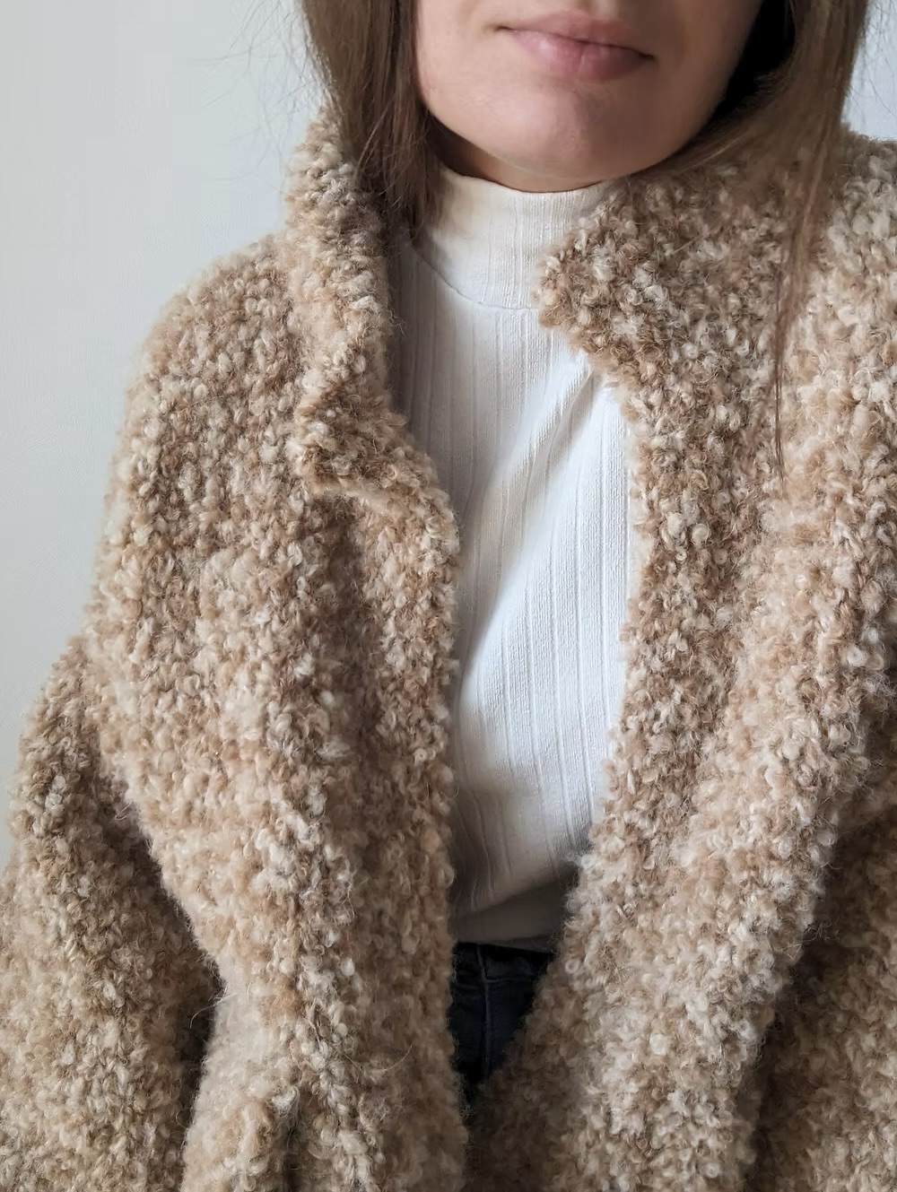 Polarteddyjakken er en oversized jakke, der er strikket sømløst oppefra i glatstrik, jakken fårsin hyggelige struktur ved at strikke med to tråde af boucle garn. Den har en høj krave ogbliver lukket med et knapbånd og usynlige trykknapper (en foreslået trykknap størrelse er ca.28 mm, i den farve der bedst matcher garnet). Jakken har vedhæftede lommer og flapper kanogså tilføjes. Ærmerne er også meget generøst formet for at nå det maksimale hygge niveau,når man har den på.