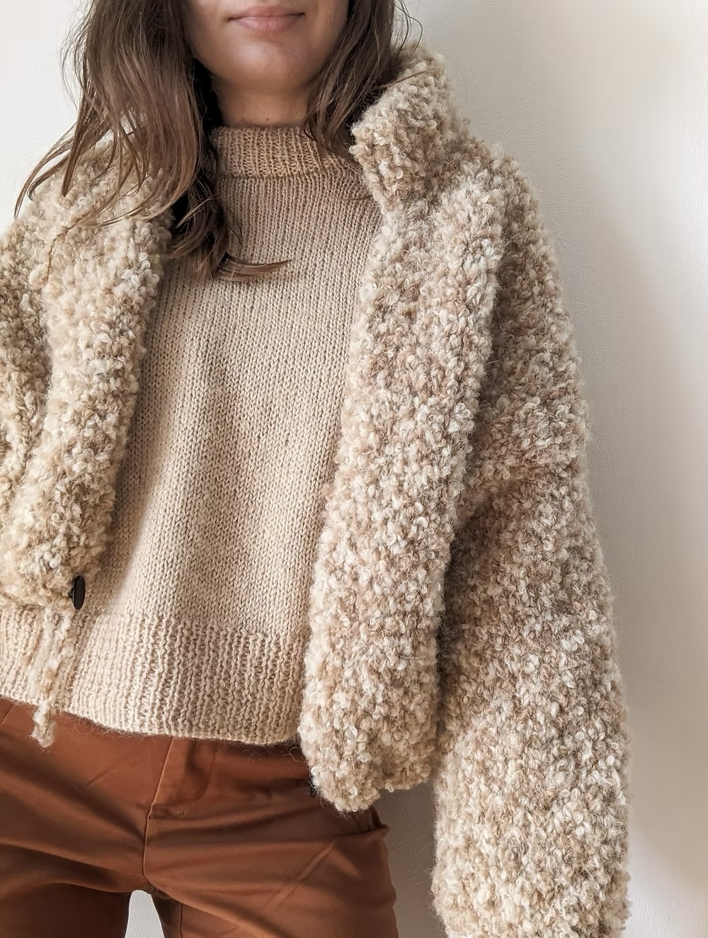 Polarteddyjakken er en oversized jakke, der er strikket sømløst oppefra i glatstrik, jakken fårsin hyggelige struktur ved at strikke med to tråde af boucle garn. Den har en høj krave ogbliver lukket med et knapbånd og usynlige trykknapper (en foreslået trykknap størrelse er ca.28 mm, i den farve der bedst matcher garnet). Jakken har vedhæftede lommer og flapper kanogså tilføjes. Ærmerne er også meget generøst formet for at nå det maksimale hygge niveau,når man har den på.