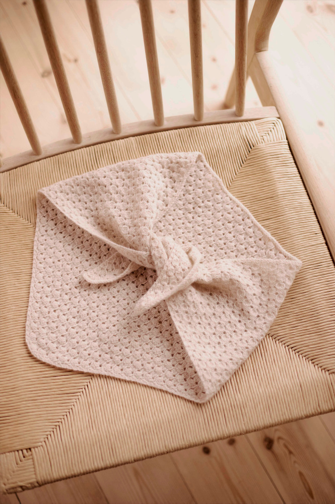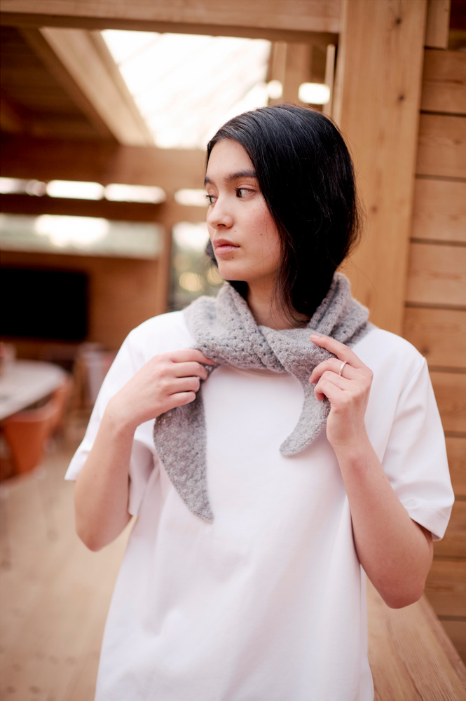 Sjalet strikkes frem og tilbage fra spidsen og op mod den lange side. Udtagningerne følger blondemønsteret og er elegant integreret i strukturen, så konstruktionen føles naturlig og flydende hele vejen igennem. Resultatet er et harmonisk sjal, hvor hver detalje sidder præcis, som den skal.