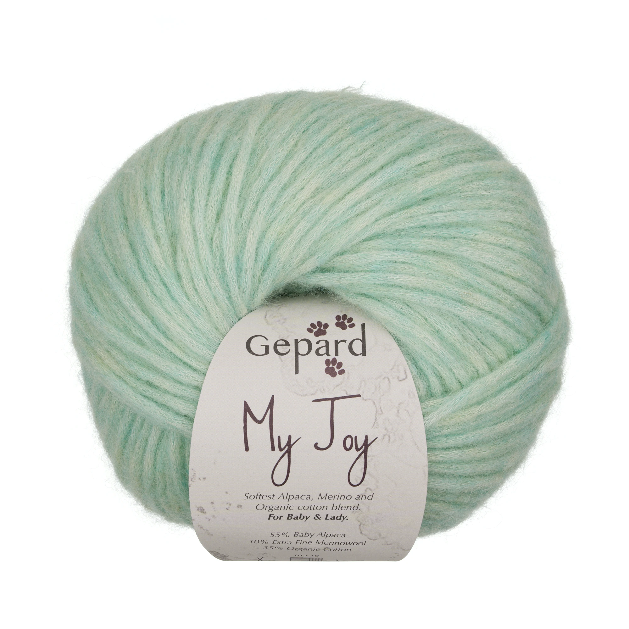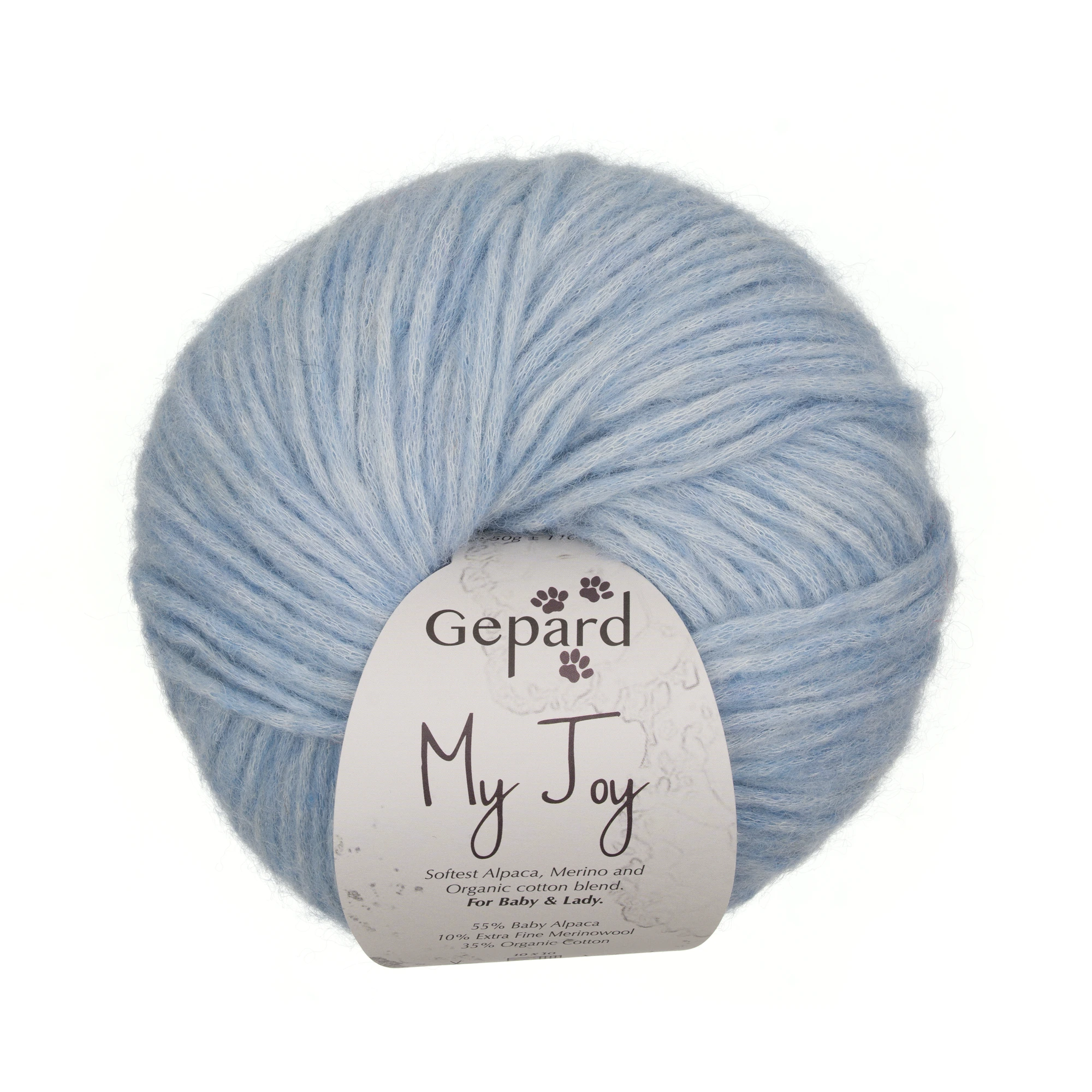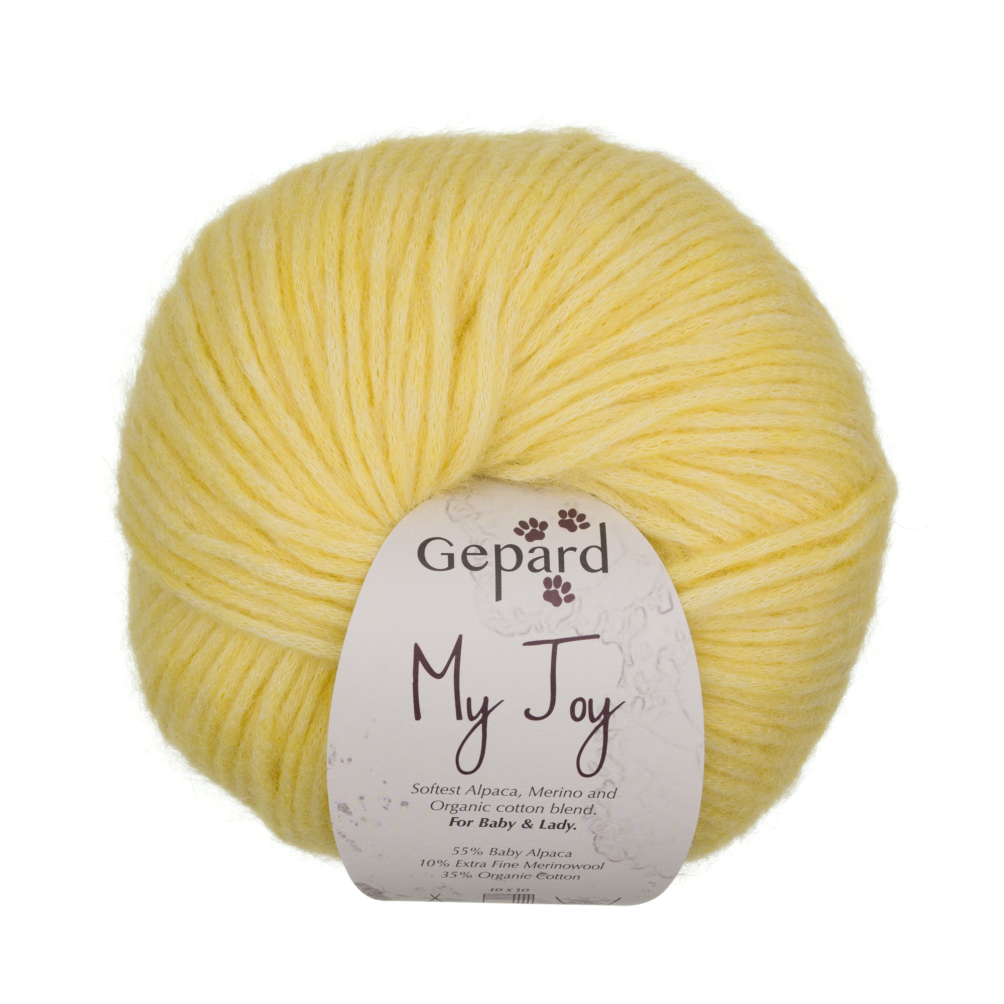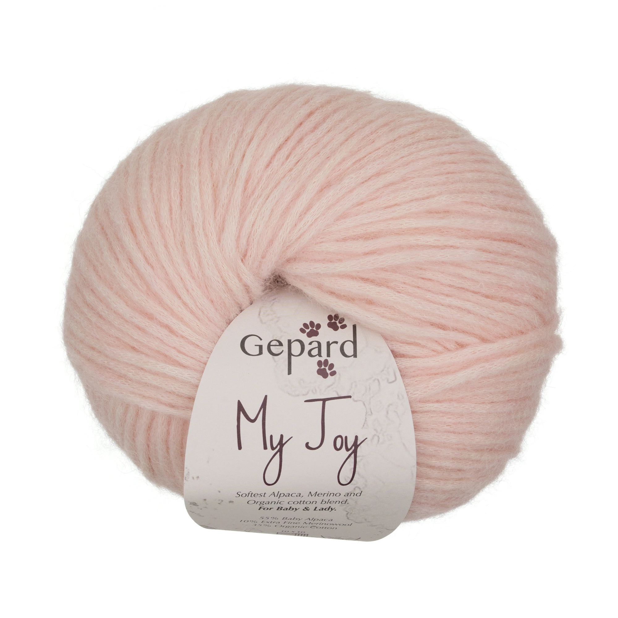 My Joy er spundet af den fineste sortering af baby alpaca, blandet med merinould og økologisk bomuld – blødere bliver det simpelthen ikke! Garnet er udviklet som et naturligt alternativ til Puno – Sus Gepard plagede deres spinderi om at lave en version uden plastik, og My Joy er resultatet.