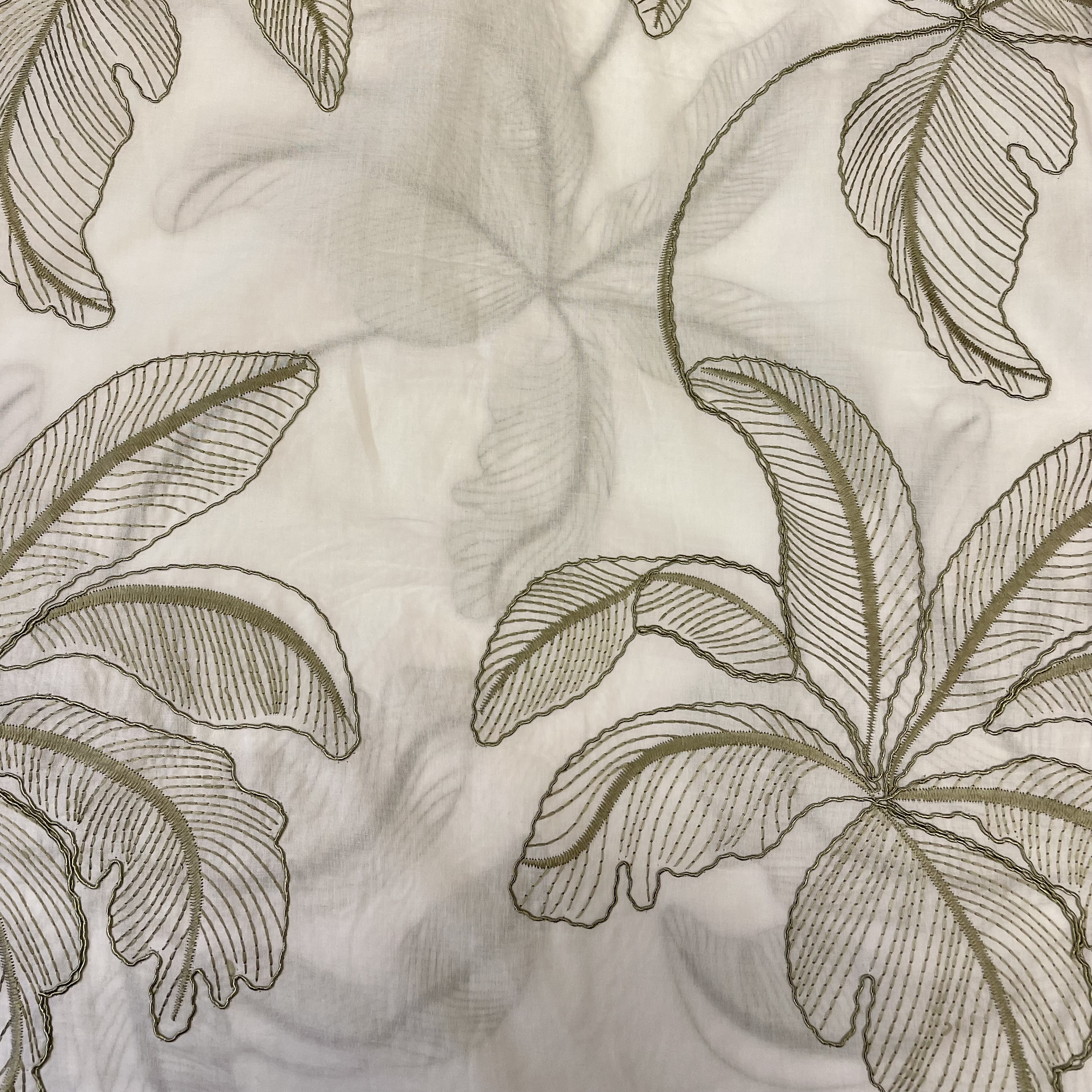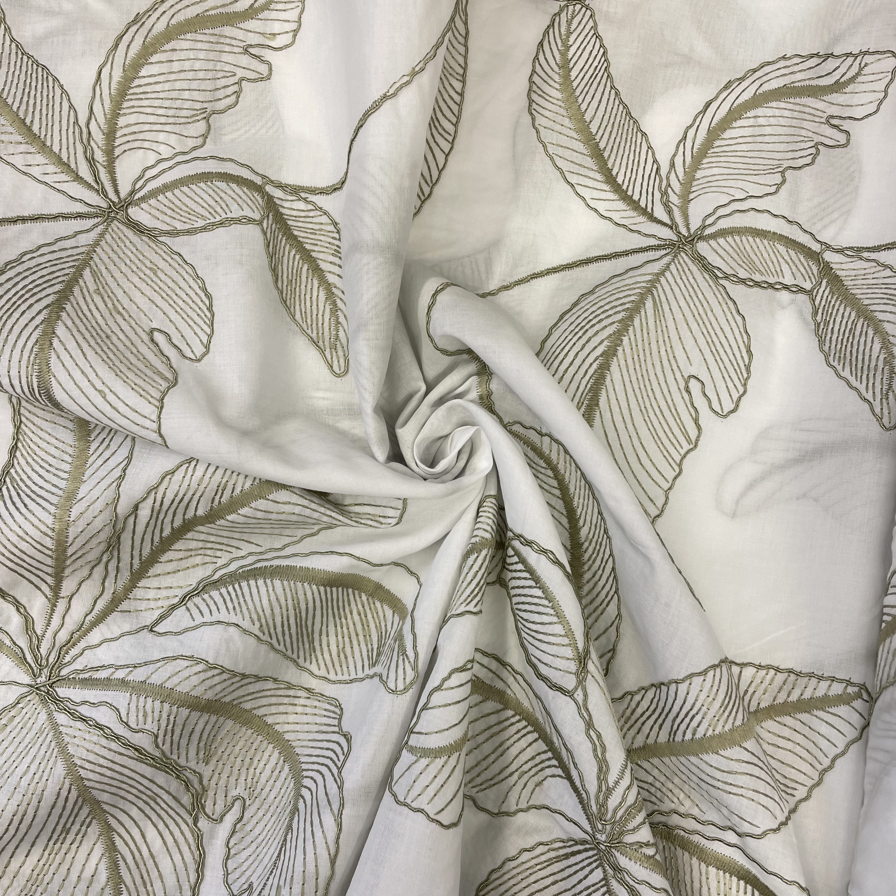 Smukt stof i bomuld med hvid baggrund og broderi i olivengrøn. Brug dette stof til kjoler, bluser eller lette sommerbukser