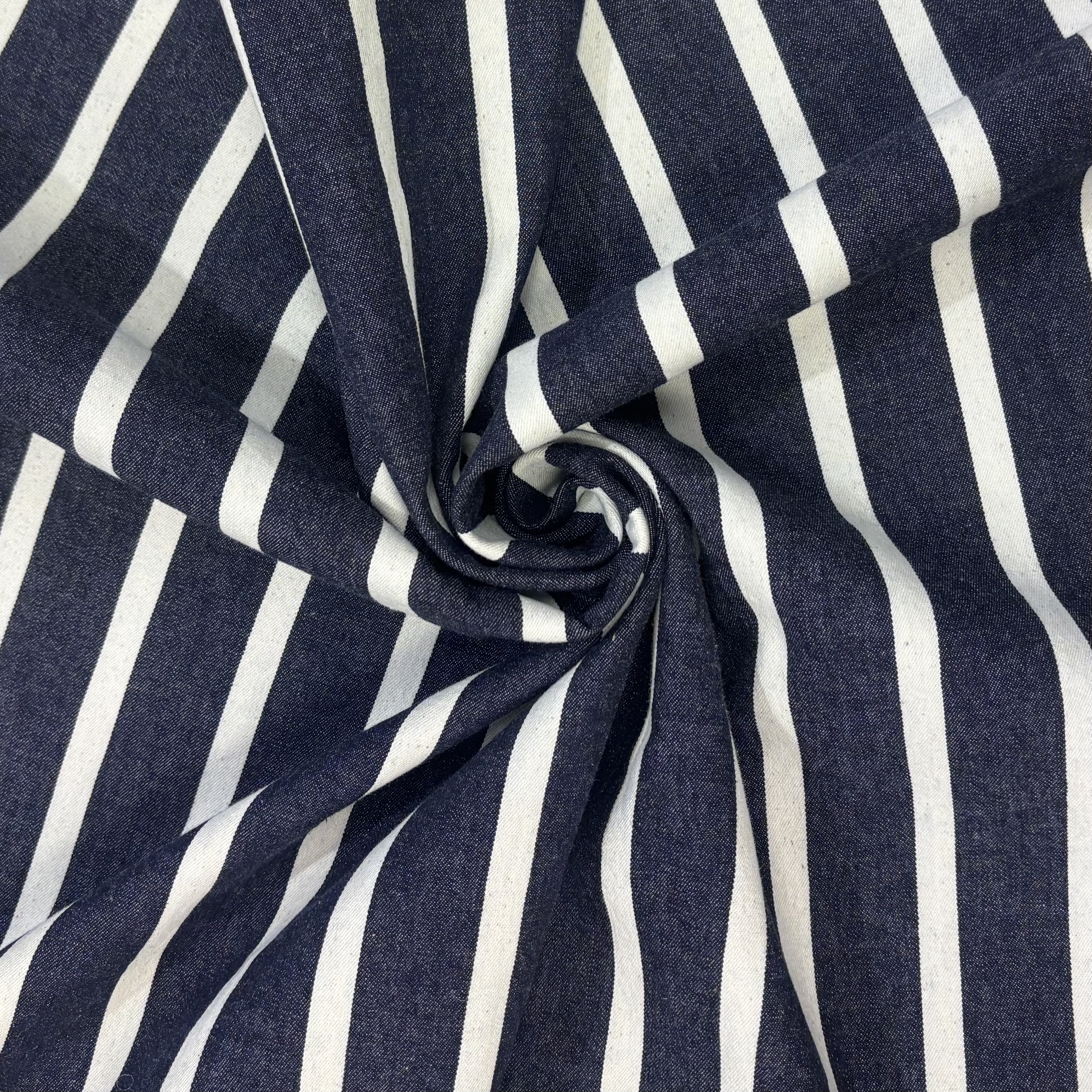 Super smuk Denim metervare direkte fra et af de helt store modehuse i Italien. Stoffet har smukke brede og smalle striber i hvid og navyblå .