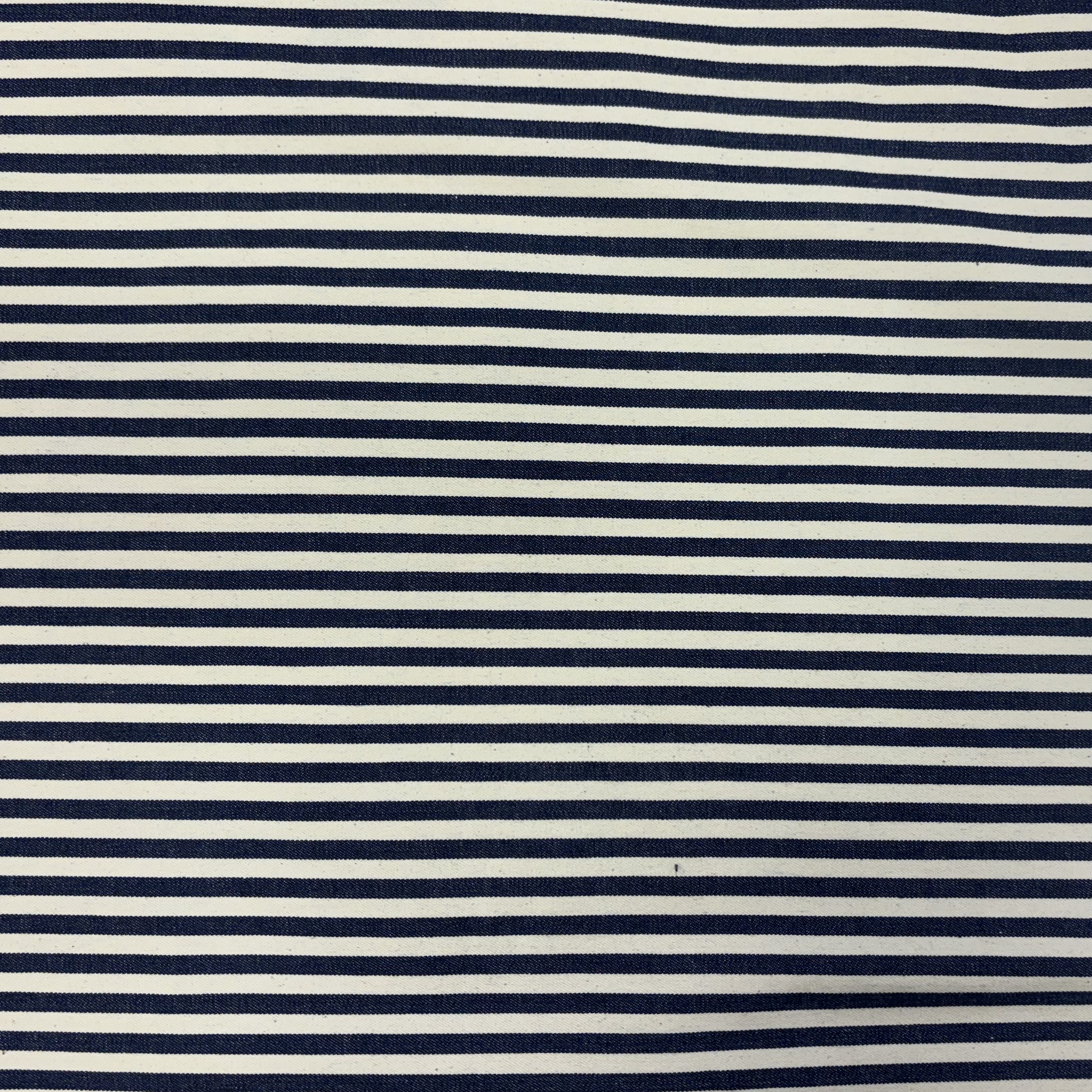Super smuk Denim metervare direkte fra et af de helt store modehuse i Italien. Stoffet har smukke smalle striber i hvid og navyblå .