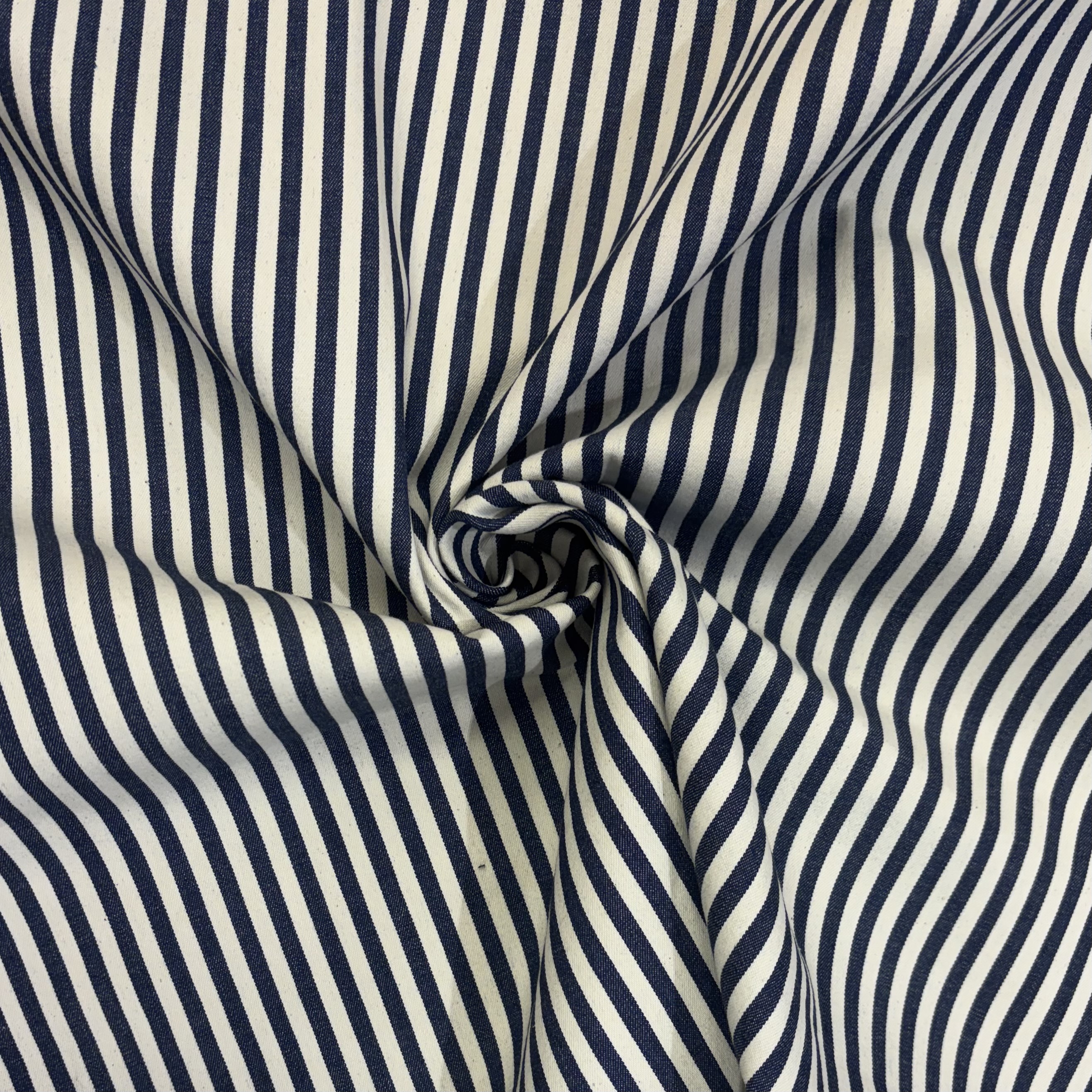 Denim i bomuld med smalle striber i hvid og navy pr. 0,25 m