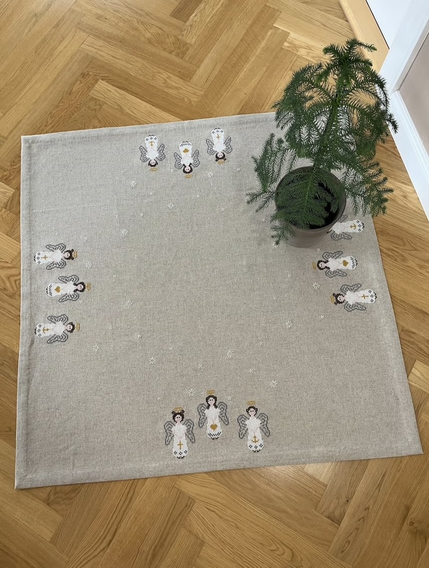 Stoffet er vores 7-trådet Floba, et mellem-groft stof i hørlook med en smuk glans, der passer perfekt til julens stemning. Sammen med de tre englemotiver skaber det en enkel, men stemningsfuld dekoration, der kan bruges år efter år.