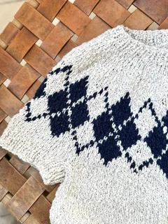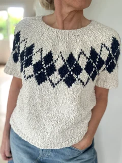 Arbejdet strikkes fra halsen ned til ærmegabet, hvor det deles op i for- og bagstykke, som derefter færdiggøres hver for sig. De korte ærmer strikkes til sidst. Toppen kræver ingen montering.