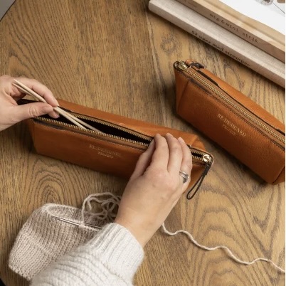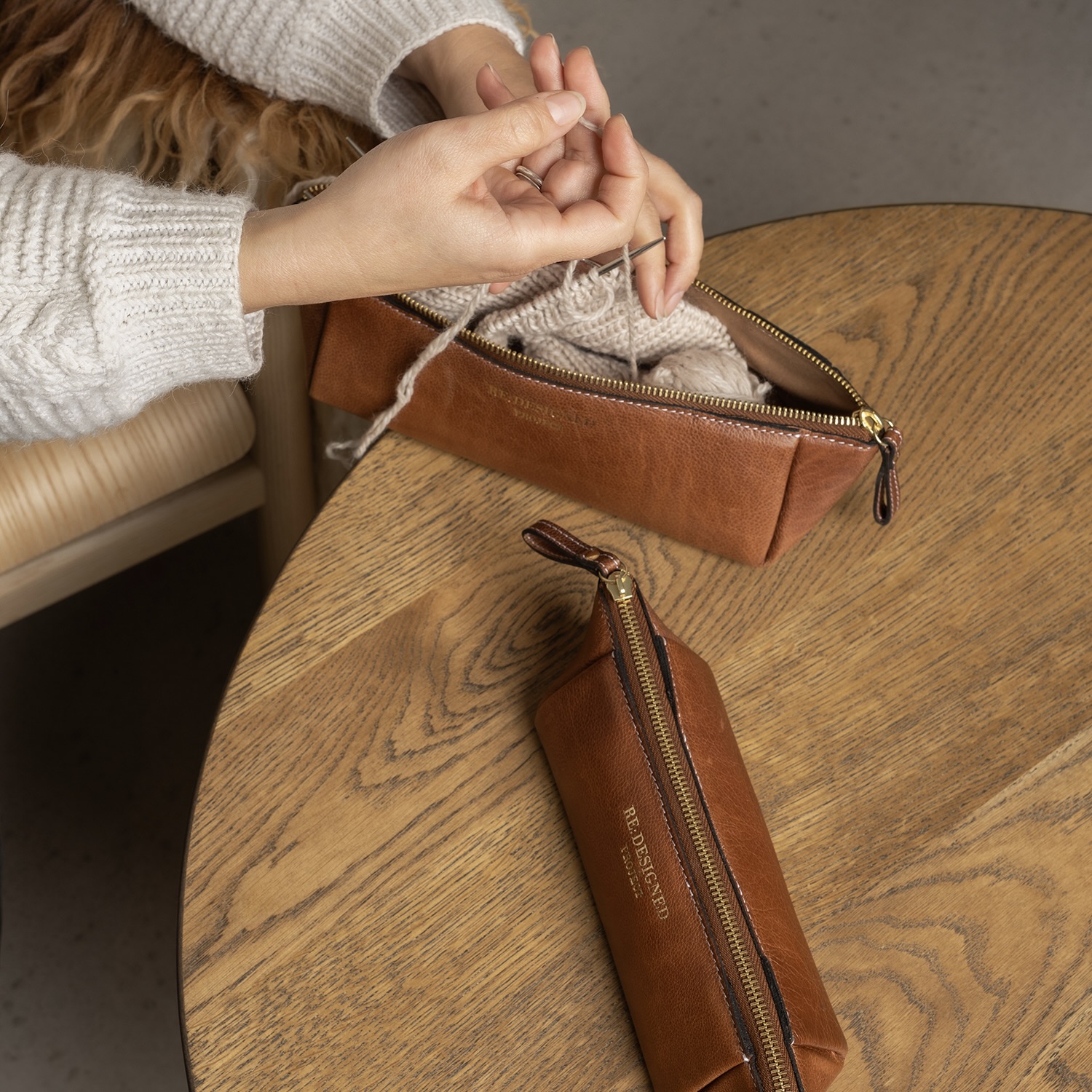 Project 11 fra Re:Designed er et fint, trekantet etui, der fungerer som et lille “penalhus” til dit strikkegrej. Den gyldne YKK-lynlås åbner op til et praktisk rum, hvor du kan organisere korte strømpepinde (op til 17 cm), hæklenåle, maskemarkører, saks, linealer og andre småting.