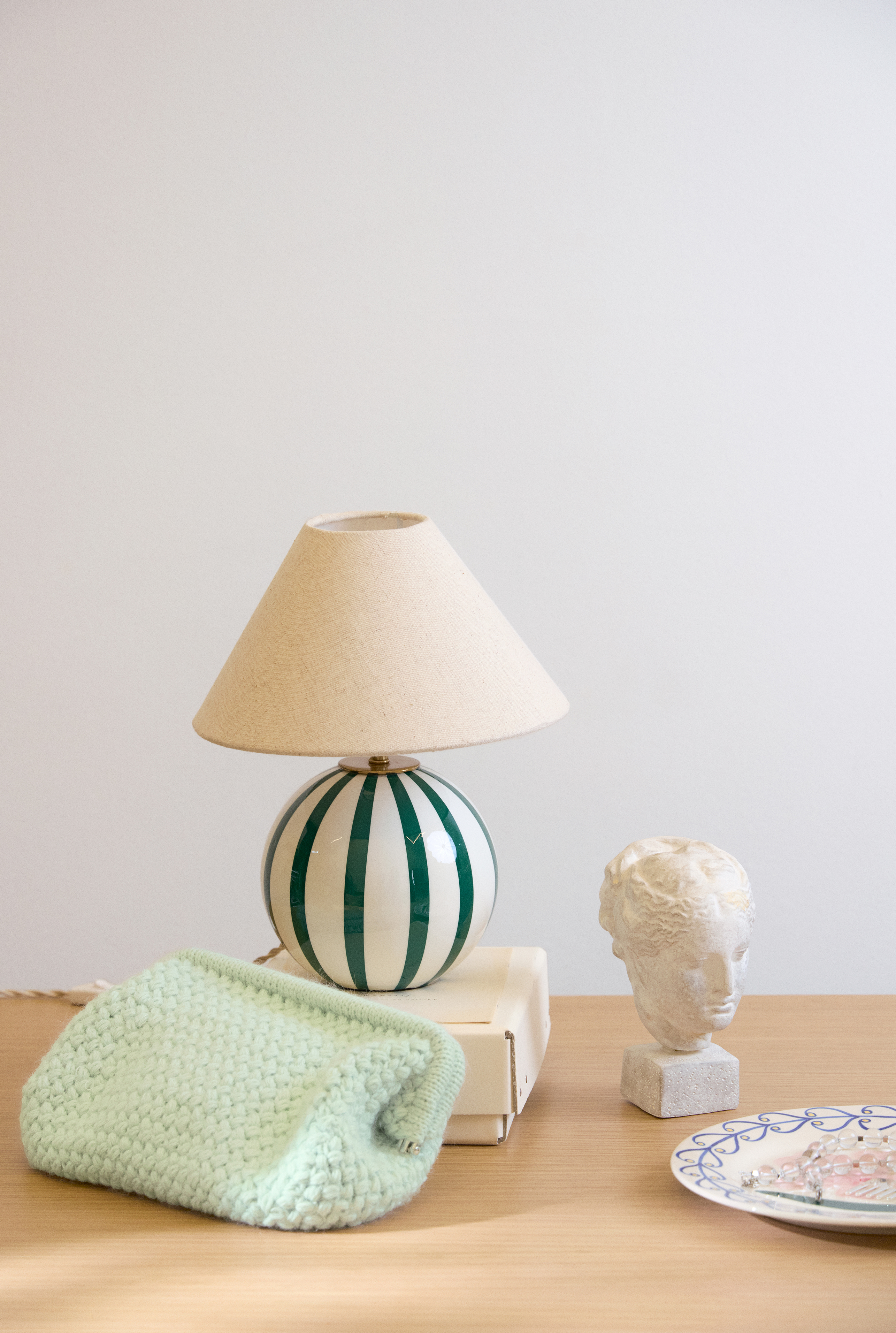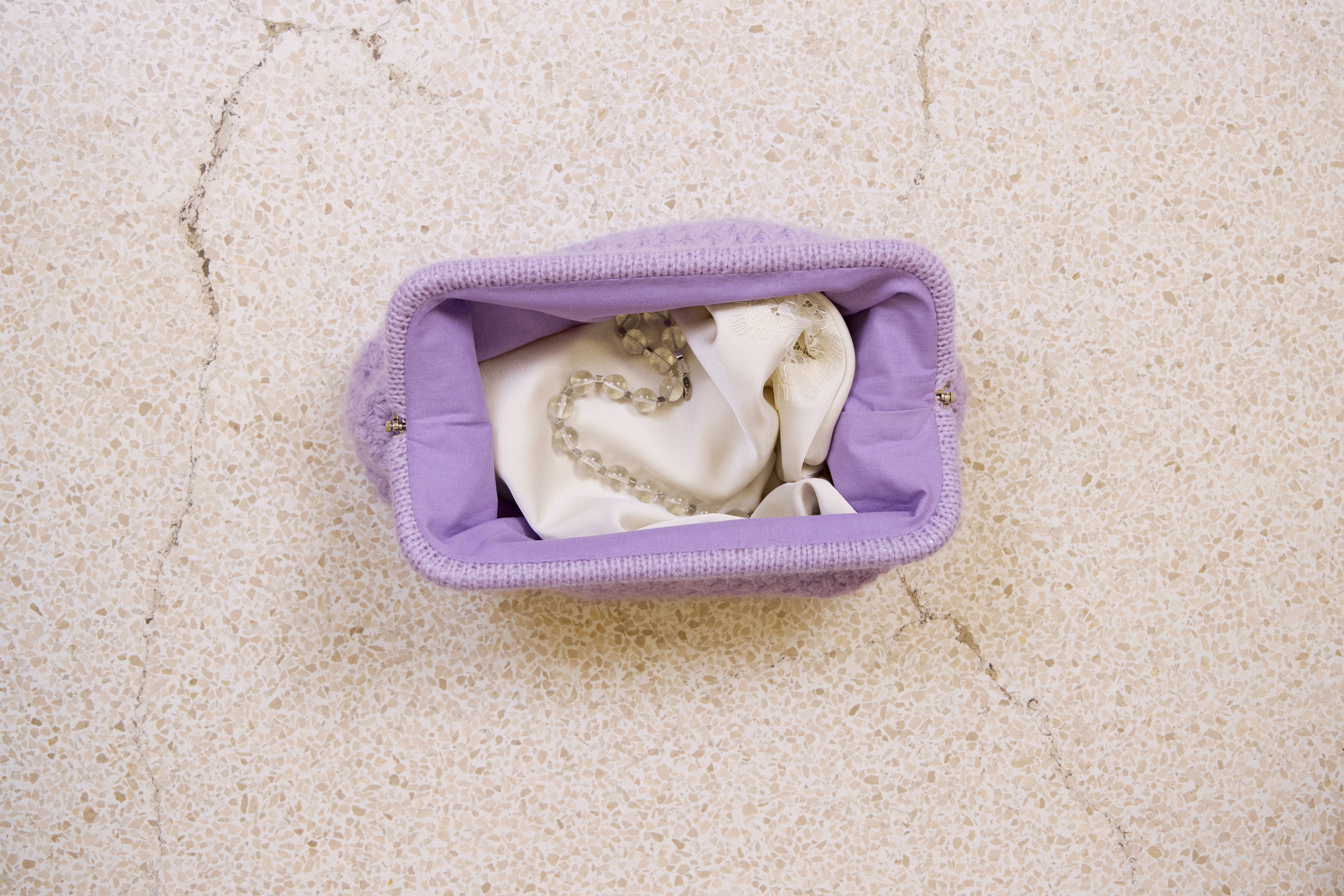 Til sidst strikkes der en kant i glatstrik, som foldes omkring clutch-rammen. Foringen sys og monteres til slut.