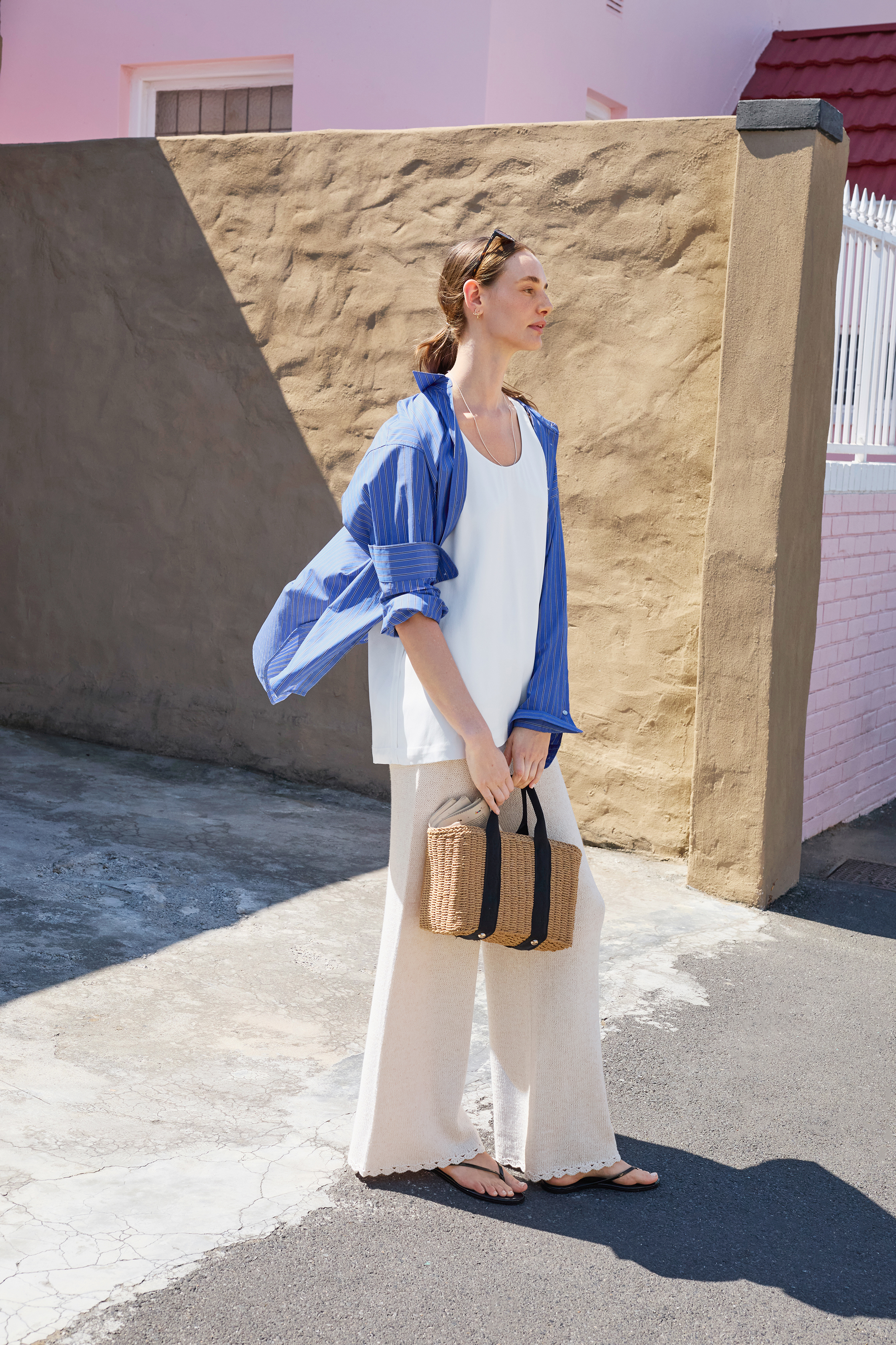Bukserne strikkes oppefra og ned i Tynn Line (holdt dobbelt), som giver et let og behageligt resultat – perfekt til de varmere måneder.