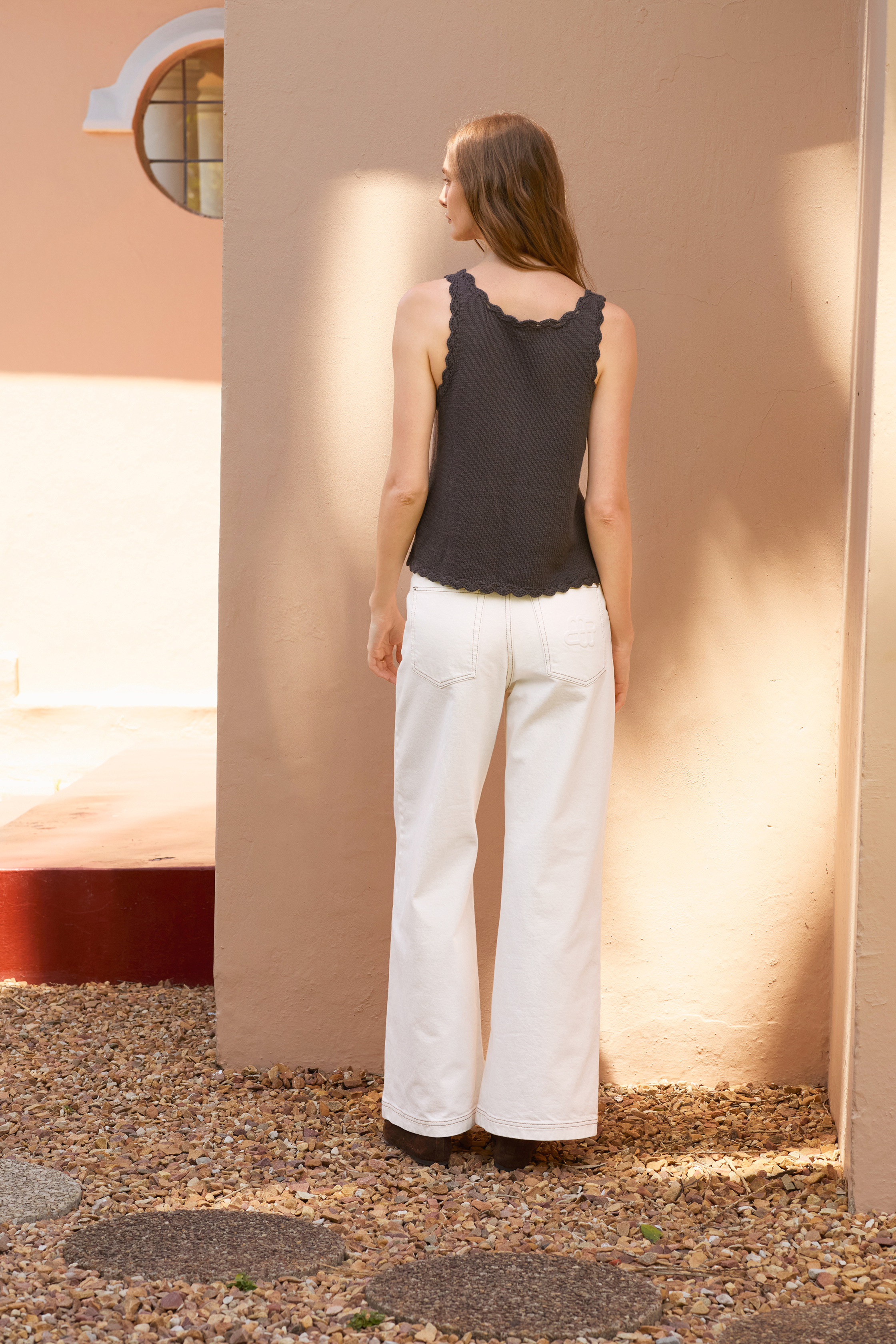 Denne top har et let og feminint udtryk med en fin A-facon og dekorative blondekanter. De hæklede kanter rundt om hals og ærmehuller giver et delikat og sommerligt look.